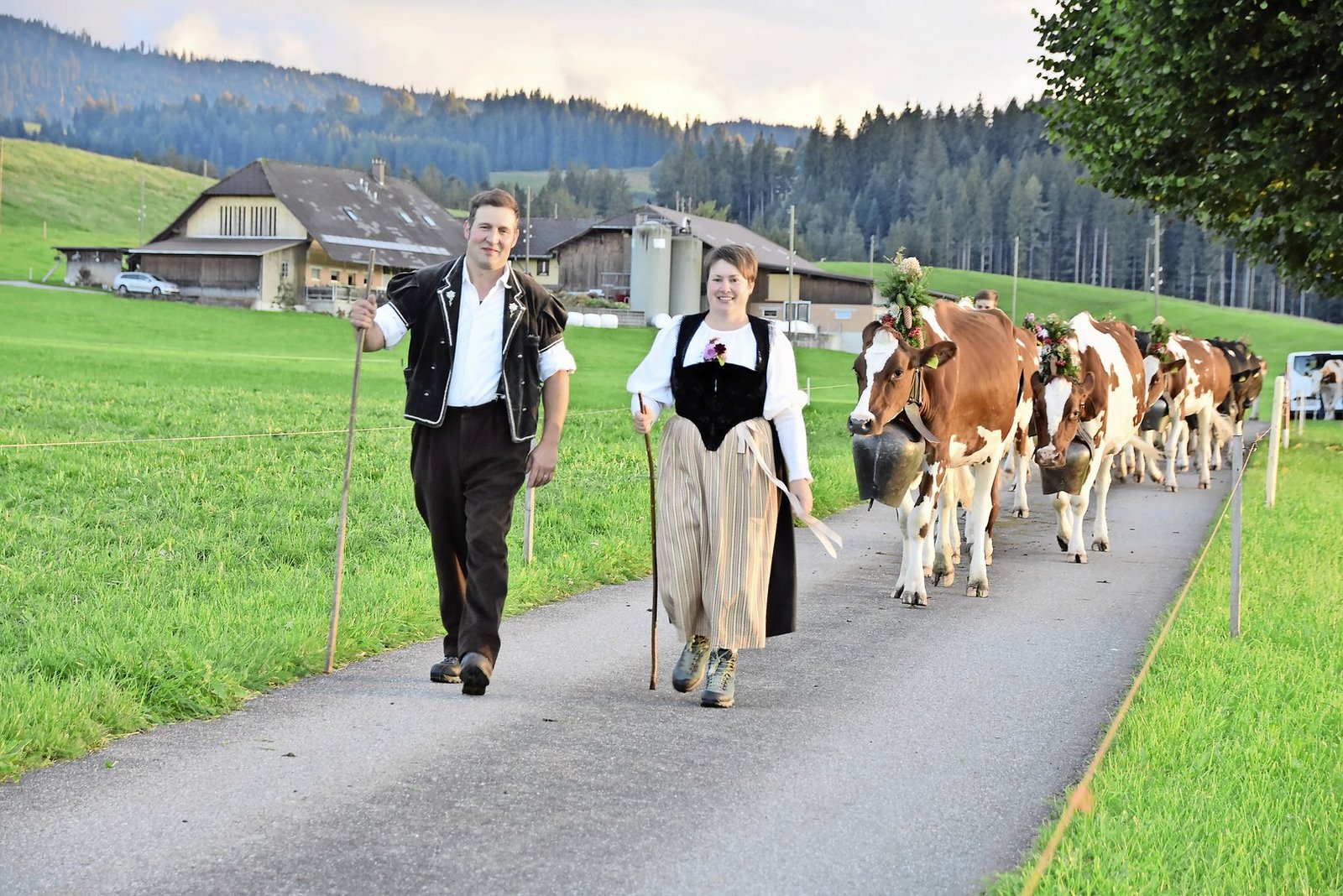 Am Sonntagabend nahmen dann über 100 Alphornbläser am Gesamtchor teil. Zum grossen Erfolg beigetragen haben sicher auch die Familien Schenk mit ihrem Alpabzug am Samstagabend. Bereits zwei Tage vorher, am Donnerstag, zügelten sie mit ihren Tieren von ihrer Alp Rämisgummen ins Tal – ein Fussmarsch von über drei Stunden. Die beiden Familien scheuten den Aufwand aber nicht, ihre Kühe für das Alphornfest noch einmal zu waschen und mit schönen Blumen zu schmücken.