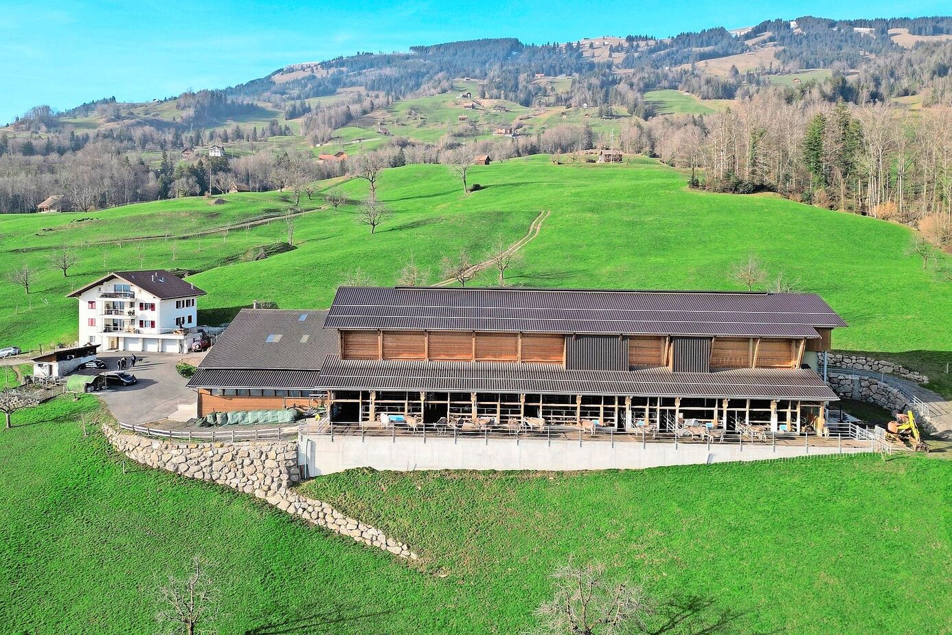 Der imposante Stall der Familie Regula und Markus Kennel ist schon von weit her sichtbar. 65 Laufmeter lang ist das Gebäude und bietet dem Vieh neben einem herrlichen Panorama auf den Schwyzer Talkessel auch viel Kuhkomfort und Platz.