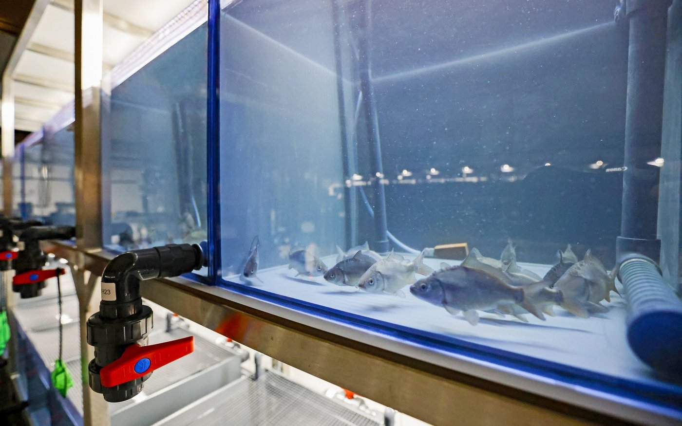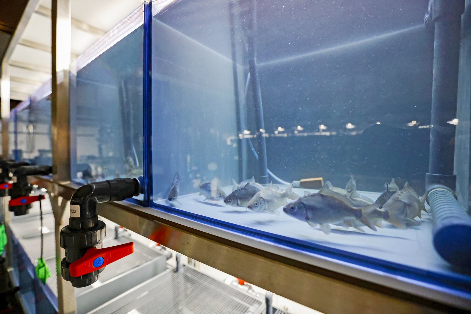 Anfang Februar sind die ersten Fische eingezogen, 40 Gramm schwere Karpfen aus einem Schweizer Zuchtbetrieb. Zuerst mussten die Fische in Quarantäne. Nachdem diese abgeschlossen war, erforscht man nun im Bereich Tierwohl das Thema Stress. Dabei werden verschiedene Stressparameter wie Kortisol untersucht. Ausserdem wird zwischen chronischem und akutem Stress unterschieden.