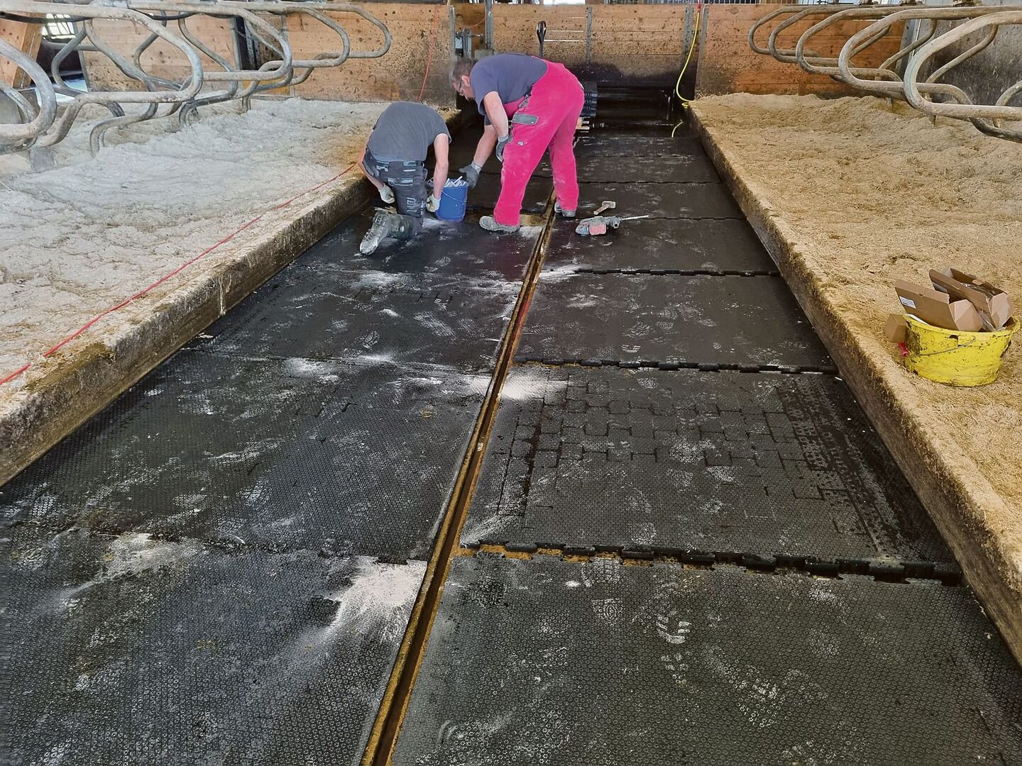 Dank der Neigung, fliesst jetzt der Urin der Kühe direkt in ein Sammelrohr und weiter in die Güllegrube – ideal, um Ammoniakemissionen zu reduzieren und um die Gummimatten trockener zu halten. Auch der Kot wird dank eines automatischen Schiebers mehrmals täglich in die Güllegrube befördert. «Wir haben sicher um die 20'000 Franken investiert», so die Betriebsleiter. Auf einer Länge von 28 x 2,90 Meter sind nun die Gummimatten Profikura P 3D in ihrem Stall montiert. Dank der weichen Unterlage fühlen sich ihre Kühe nun viel trittsicherer und falls mal eine auf die Knie fällt, landet sie weicher.