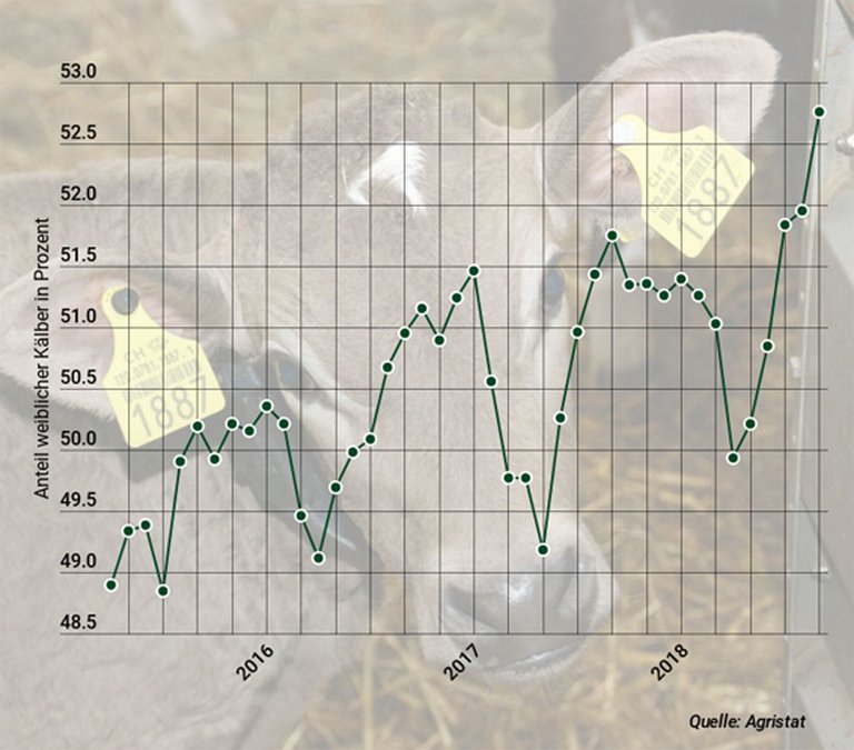 8,8 Prozent der 47'500 Kälber, die im Juli 2015 das Licht der Welt erblickten, waren weiblich. Im September 2018 lag der Anteil gemäss Schweizer Bauernverband bei 52,7 Prozent (siehe Grafik). Dass immer mehr weibliche Kälber geboren werden, ist kein Zufall. Denn seit einigen Jahren können Bauern selber das Geschlecht der Kälber bestimmen. Möglich macht das eine Technologie, welche die Trennung von X- und Y-Spermien erlaubt.