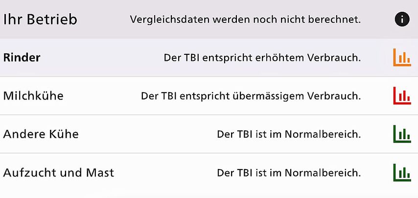 Aktuell sind bei den Nutztierkategorien «Geflügel» und «Rinder» die Daten aus den Vergleichsjahren 2021 bis 2023 einsehbar. Als nächster Schritt ist vorgesehen, für beide Benchmarks die Daten aus dem Jahr 2024 zu ergänzen. Weitere Benchmark-Nutztierkategorien sind derzeit in Abklärung.