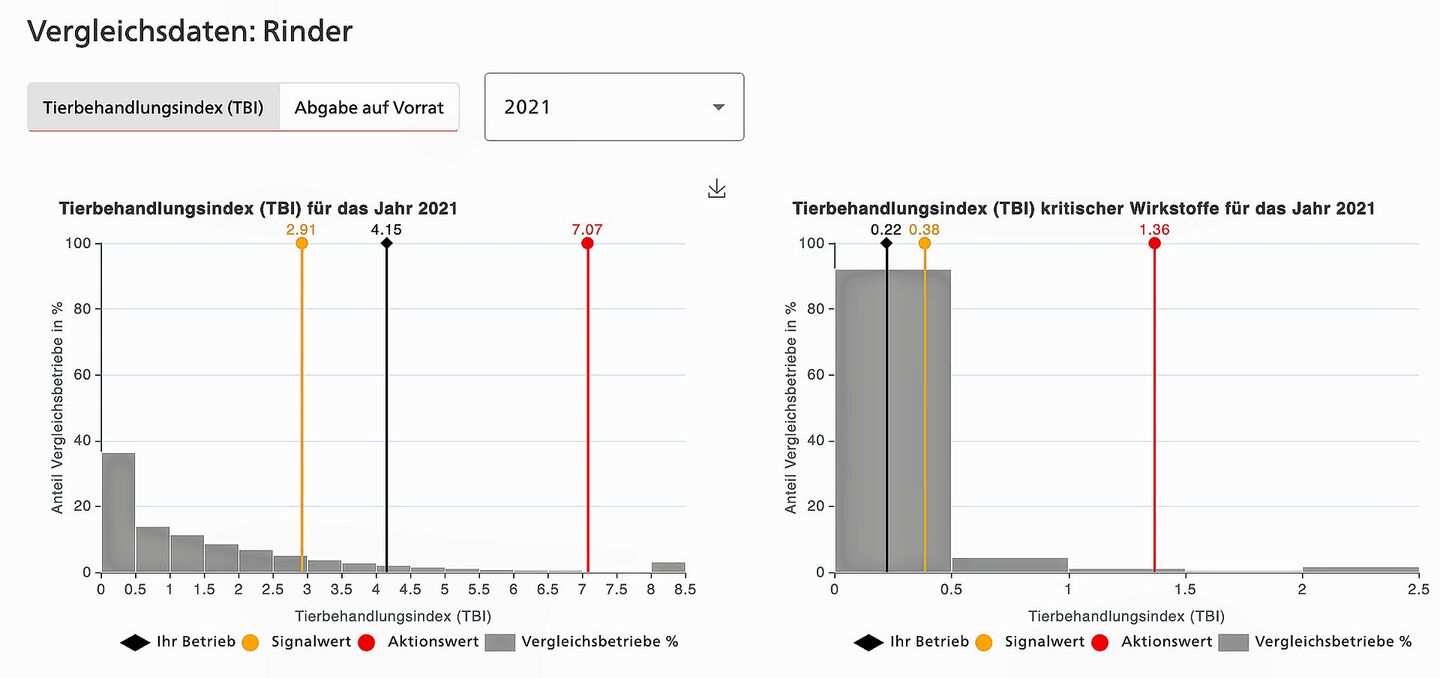 Die Vergleichsdaten mehrerer Jahre ermöglichen es allen Beteiligten, sich mit dem betriebsspezifischen Antibiotikaverbrauch vertraut zu machen. So können Trends abgelesen und gegebenenfalls, auf freiwilliger Basis, in Zusammenarbeit mit dem Tierarzt oder der Tierärztin Behandlungsroutinen hinterfragt und Massnahmen zur Reduktion des Antibiotikaverbrauchs ergriffen werden. Gerade zu Beginn ist es auch wichtig, dass eventuelle Fehleingaben erkannt und durch den Tierarzt oder die Tierärztin korrigiert werden können. Durch die Information «Wo stehe ich im Vergleich zu anderen» erwarten wir eine Sensibilisierung der Tierhaltenden und gegebenenfalls freiwillig Massnahmen zur Reduktion des Antibiotikaverbrauchs.