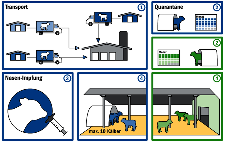 - Transport (Punkt 1): Die Masttiere stammen meist von unterschiedlichen Herkunftsbetrieben. Werden die Tiere während des Transports vermischt, können Erreger übertragen werden, die eine Erkrankung auslösen können. Im Projekt wurden die Kälber pro Geburtsbetrieb separat auf direktem und möglichst kurzem Weg auf den Mastbetrieb transportiert.