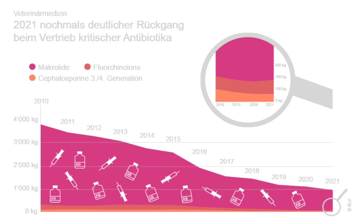 Die Vertriebsfirmen in der Schweiz geben immer weniger Antibiotika an die hiesigen Tierärzt(innen) ab, stellt das Bundesamt für Lebensmittelsicherheit und Veterinärwesen (BLV) fest. 2011 lag die Gesamtmenge verkaufter Wirkstoffe noch bei 60'000 kg, 2021 sank sie auf 28'000 kg, was einer Abnahme um 53 Prozent innert 10 Jahren entspricht. Im Vergleich zum Vorjahr sank der Wert über alle Wirkstoffklassen hinweg um 1,6, bei den kritischen Antibiotika um 7 Prozent. Das BLV interpretiert diese positive Entwicklung so, dass sowohl Tierärzte als auch Tierhalter(innen) stark auf das Thema Antibiotika sensibilisiert sind.