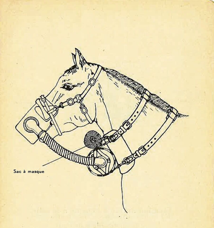 Die Atemschutzausrüstung für Pferde und Maultiere bestand aus der eigentlichen Maske, die in einem Beutel aus leinenem Zeltstoff verstaut wurde, einem auf Pferde ausgelegten Filter mit eigener, wasserdichter Tasche sowie aus Aufhängungsvorrichtungen und Riemen zur Befestigung am Reittier.