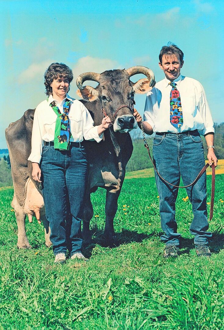 Auf der Weide waren die beiden Kühe unzertrennlich, die stärkere Perla schützte die schwächere Mörli vor Angriffen anderer Artgenossinnen. In den 1990er-Jahren nahmen wir jeweils mit mehreren Kühen an der Amtsschau in Willisau LU teil. Dort durften wir die Plakette für die höchste Lebensleistung sieben Jahre nacheinander zuerst für Perla, später für Mörli entgegennehmen. Der Heimmarsch mit allen Kühen, die wir mit Blumen schmückten, war immer der Höhepunkt der Amtsschau. Auch da war die Hierarchie klar: Perla lief mit der grössten Fahrtreichel jeweils in Front, dicht gefolgt von Mörli.