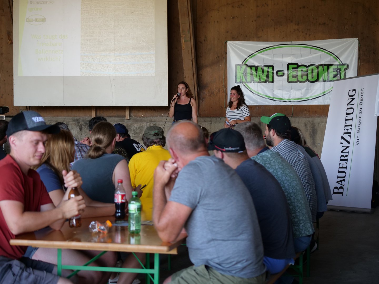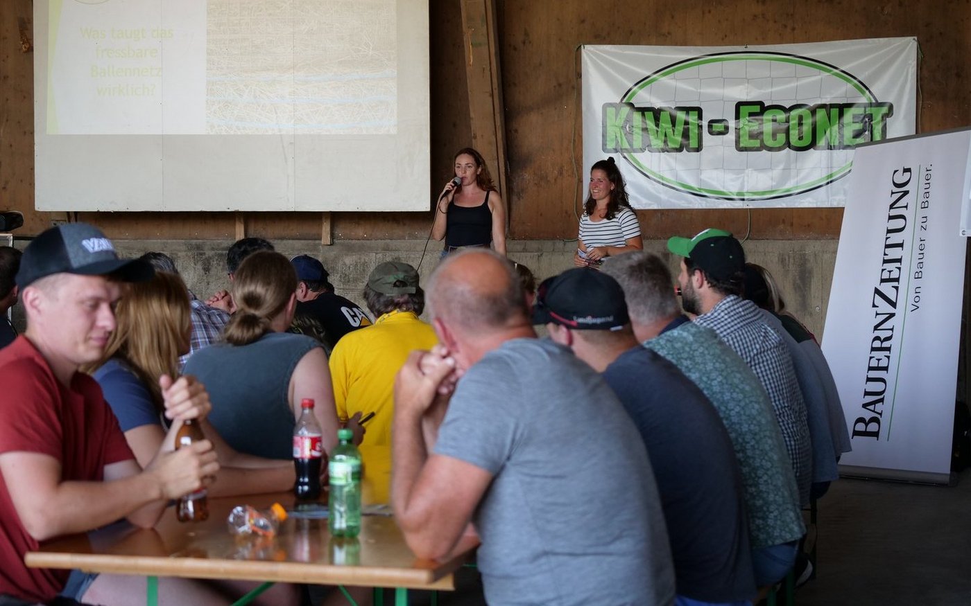 Die Plastik-Problematik beschäftigt die landwirtschaftliche Basis, zudem verunmöglicht das Nylonnetz in manchen Situationen auf dem Betrieb einen effizienten Arbeitsablauf. Das passiert beispielsweise beim Eingeben einer Heu- oder Siloballe in den Futtermischwagen oder beim Vorlegen von Heu für Pferde oder für Rindvieh in der Futterraufe. Da sind sich die anwesenden Bauern an diesem sommerlichen Abend einig. Könnte man das Ballennetz dranlassen, weil es biologisch abbaubar ist, würde dies einerseits weniger Abfall verursachen und es würde Arbeitszeit einspart.