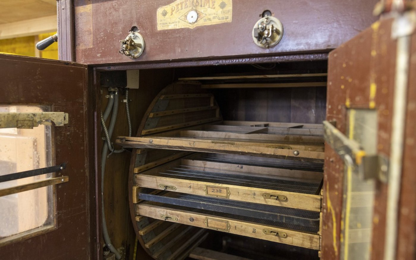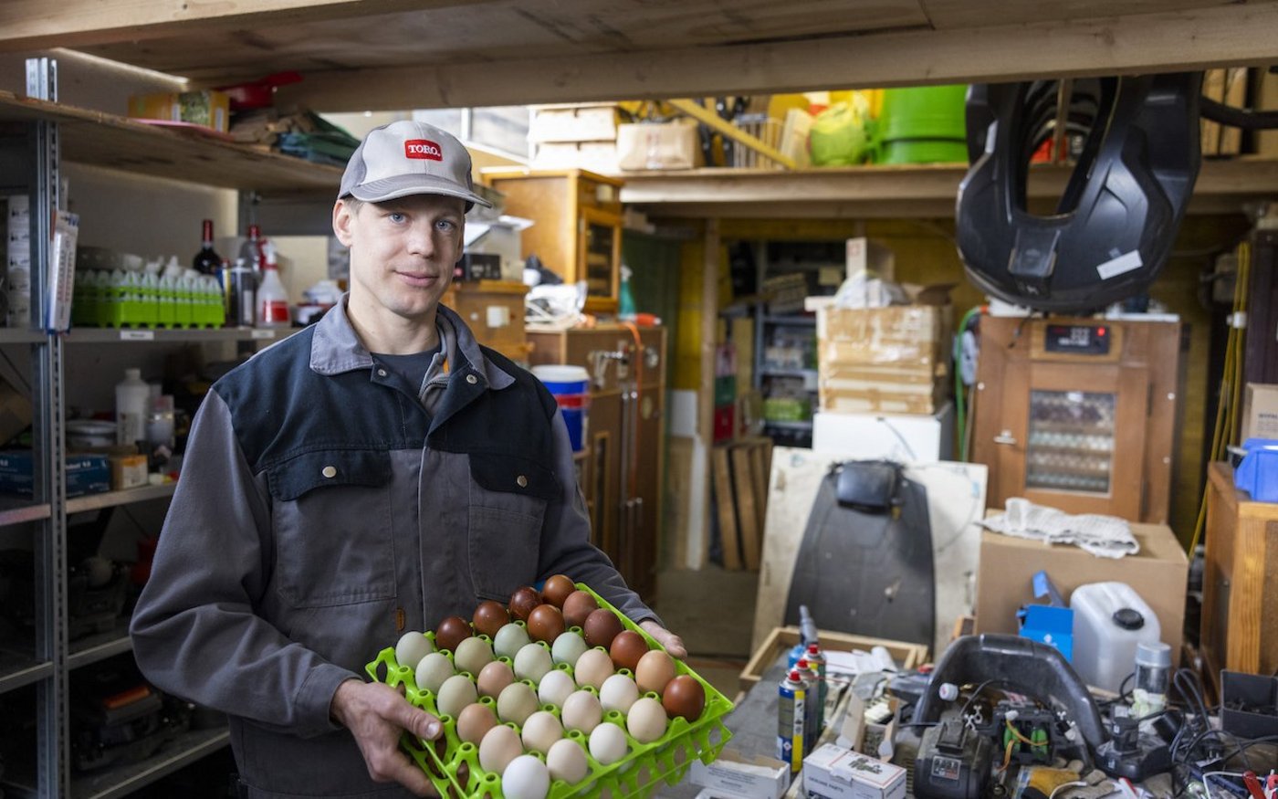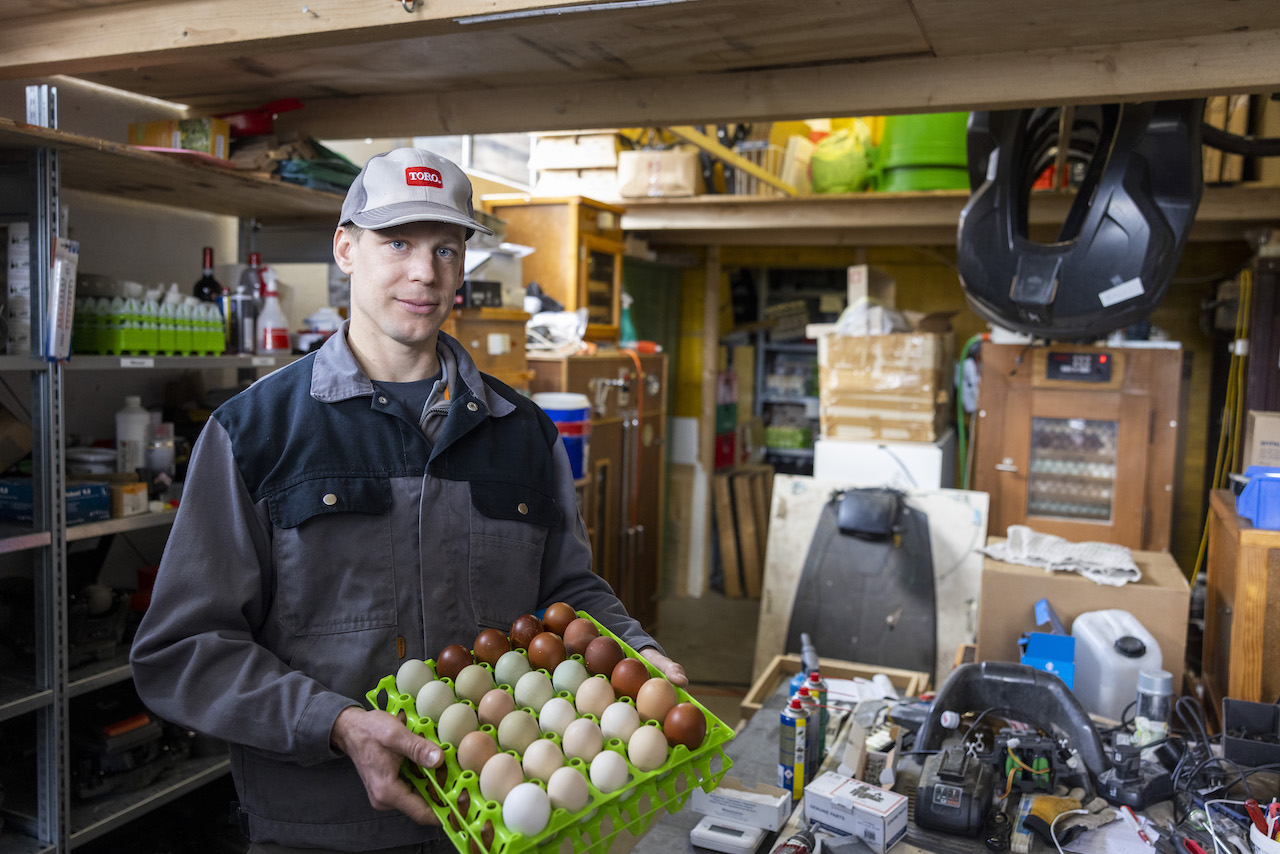 Aktuell ist Alexander Morf als Gärtner selbstständig und hat sich auf den Service von Rasenmährobotern spezialisiert, die er scherzhaft als «Schildchrötli» bezeichnet. In seiner Werkstatt in Trüllikon ZH stapeln sich neben den Robotern Eier in verschiedenen Farben, zwei von fünf Brutschränken summen leise vor sich hin und im vorderen Bereich lagert Geflügelfleisch in grossen Kühltruhen. «Alle Brutschränke sind zwischen 30 und 80 Jahre alt», bemerkt Morf. Er hat sie mehr oder weniger zufällig gefunden beziehungsweise erwerben können, zum Beispiel von älteren Kunden seiner Gärtnerei. Sie funktionieren aber tadellos. Mit einem Hebel dreht der Gärtner zwei- bis dreimal täglich die bunten Eier, in denen in der Wärme langsam Küken heranwachsen. Für den Schlupf kommen sie in einen anderen Schrank. «So habe ich den Staub der Küken nicht in allen Geräten», so die Begründung.