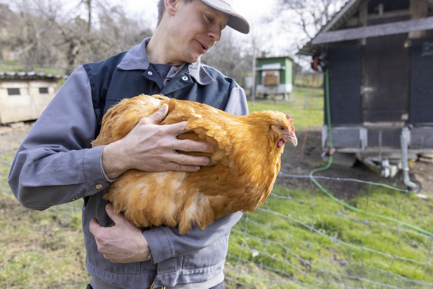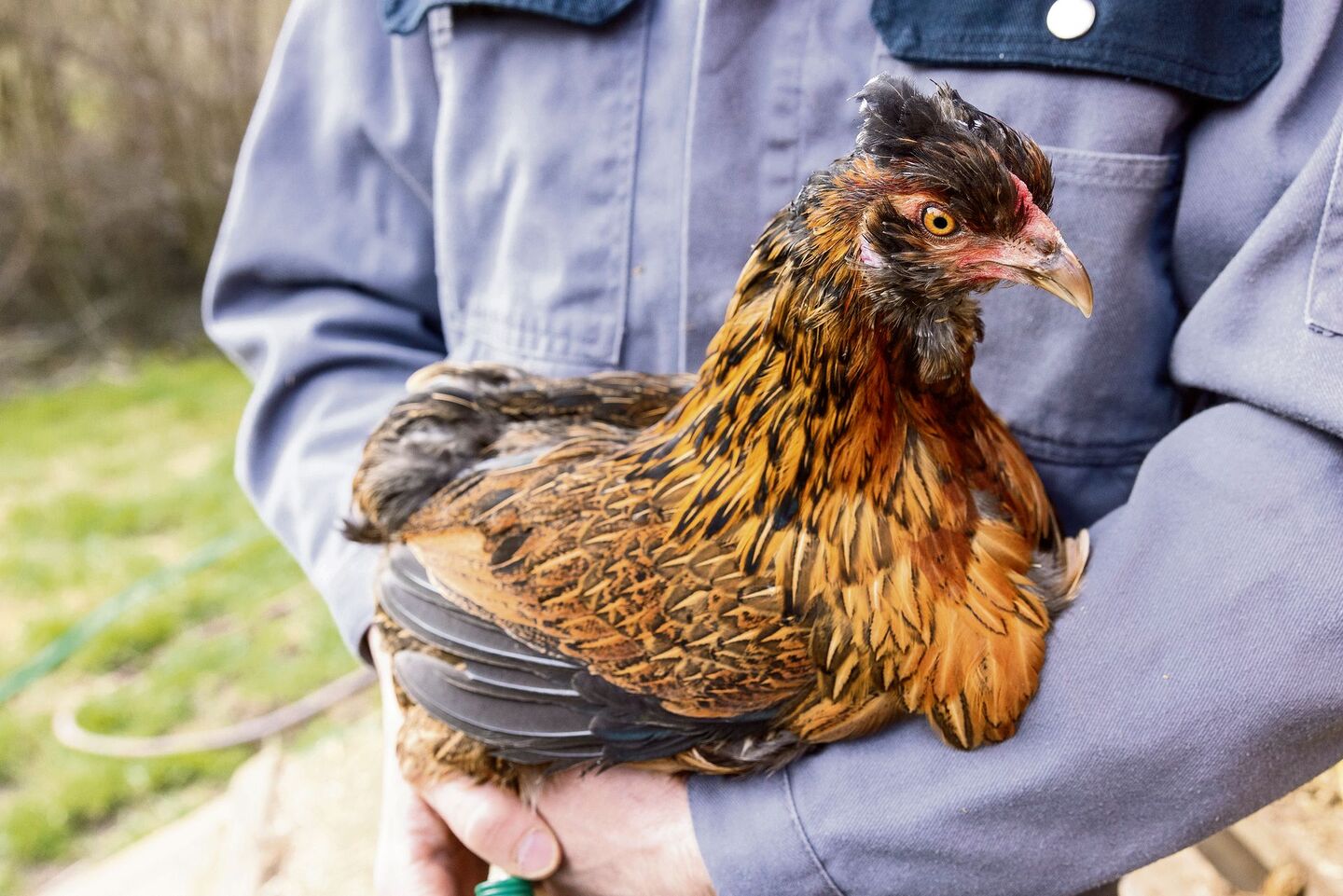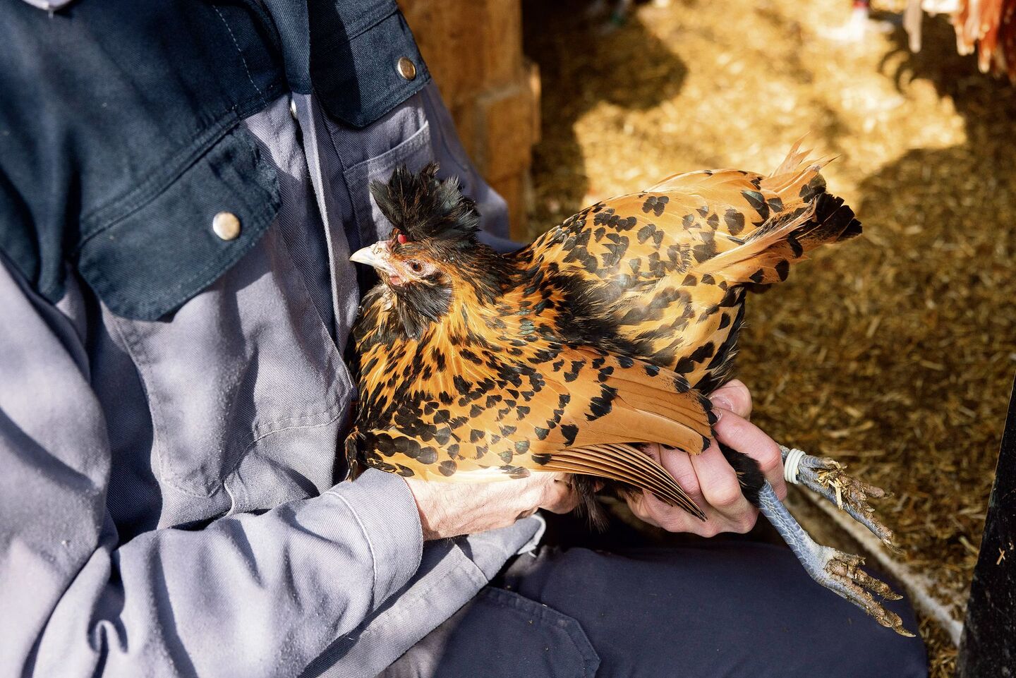 Vom Suppentopf sind die rund 300 Elterntiere auf der leicht abschüssigen Streuobstwiese noch eine Weile entfernt. Nach Rasse getrennt leben Hennen und Hähne in den kleinen Ställen, aufgrund der Massnahmen zum Schutz vor der Vogelgrippe dürfen sie im Moment die Weiden nicht nutzen. Mit einem lauten «Gugugg» macht sich Alexander Morf bemerkbar, wenn er sich nähert. Während sich das Marans-Huhn gelassen von ihm auf den Arm nehmen lässt, muss er bei den lebhaften, schwanzlosen Araucana schnell zupacken, um eine zu erwischen. Die südamerikanische Rasse wurde einst von den Mapuche, einem indigenen Volk, gehalten. «Die Leute sagen, dass Orpington nicht auf Sitzstangen hüpfen», erzählt Morf. «Aber es ist wie mit Kindern oder Hunden: Man kann sie erziehen», ist er überzeugt. So setzt er bei Bedarf die Junghühner jeden Abend auf die Stangen, bis sie es gelernt haben.