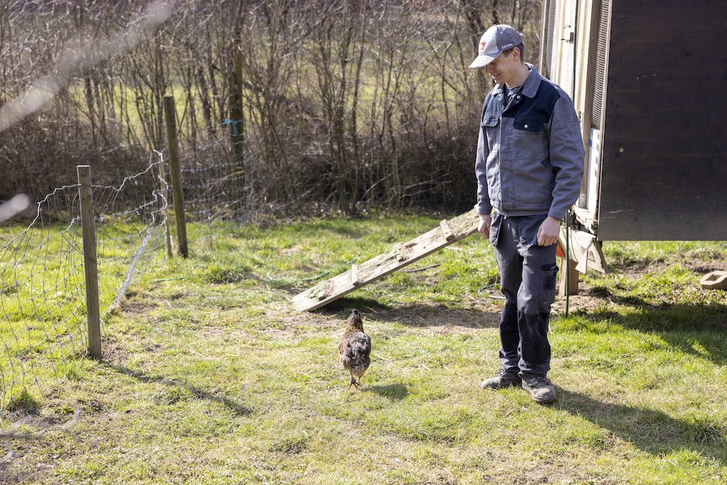 Am Anfang waren bei Alexander Morf weder Huhn noch Ei, sondern Rinder. «Ich bin in einer Grossfamilie auf einem Milchwirtschaftsbetrieb aufgewachsen», erzählt der Zürcher. Als Kind sei er lieber im Stall gewesen, als sich um Hausaufgaben zu kümmern. Trotzdem faszinierte ihn Geflügel schon damals mehr als die Wiederkäuer. Von seinen Eltern aber hiess es, auf dem Hof gebe es keinen Platz für eigene Hühner. In der Oberstufe organisierte er sich seine ersten Küken, «dann mussten wir eben einen Stall bauen», sagt er schmunzelnd. Als die Familie von Milchwirtschaft auf Rinder- und Trutenmast umstellte, musste die Geflügelzucht allerdings aus hygienischen Gründen weichen. Es habe lange gedauert, einen geeigneten neuen Standort zu finden. «Ich nutze Randzonen, die für die Bauern wenig interessant sind», erklärt Alexander Morf. Entsprechend sind seine Flächen meist steil.