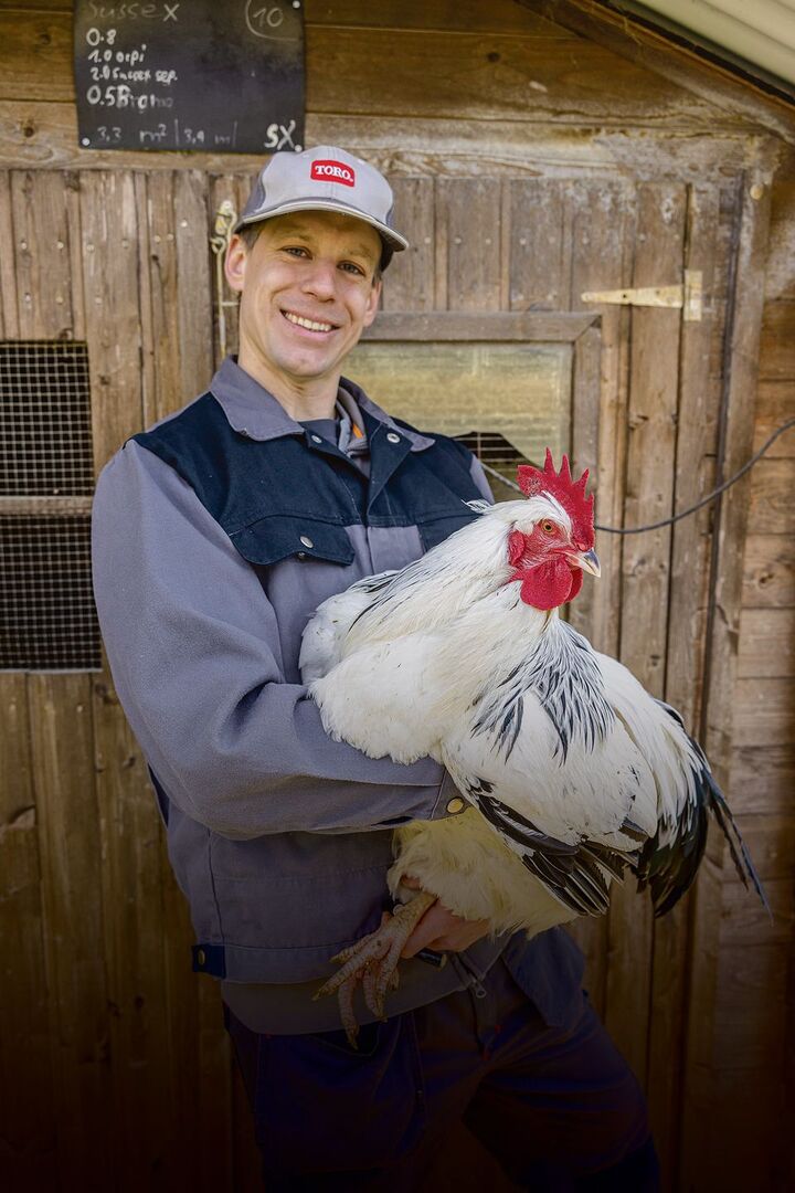 «Bei mir ist alles aussergewöhnlich», bestätigt Alexander Morf. Zärtlich streicht er über das bläulich glänzende Gefieder einer Marans-Henne. Typisch sind für die französische Rasse ihr ruhiges Gemüt und die dunkelbraunen Eier. Diese landen nicht nur in der Pfanne: Der 33-Jährige ist leidenschaftlicher Geflügelzüchter und will den Verkauf von Junghennen in Zukunft intensivieren.