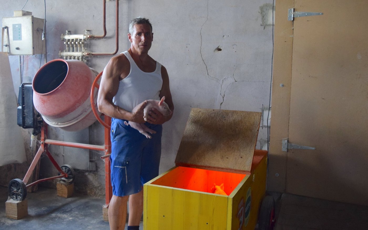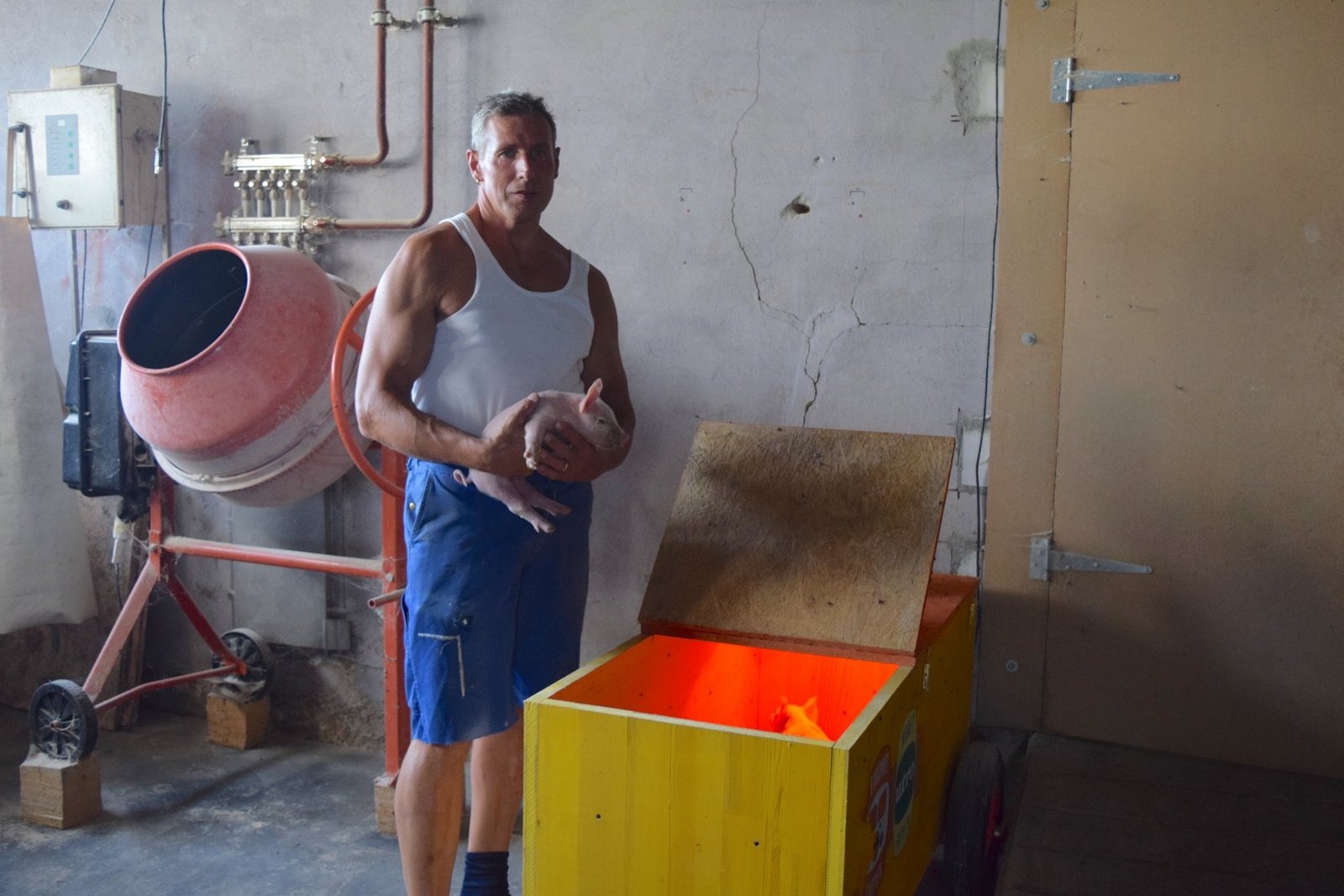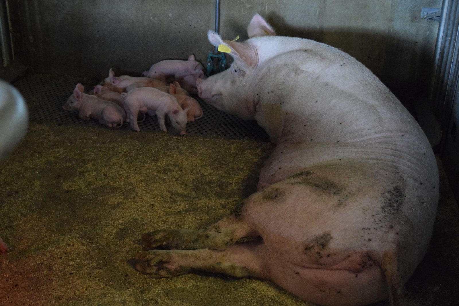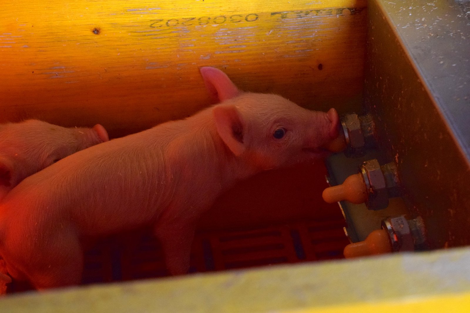 Er strebt ausgeglichene Würfe mit maximal elf Ferkeln an. Überzählige Ferkel, jeweils die kleinsten und schwächsten eines Wurfes, kommen drei Tage nach der Geburt in den Ferkelwagen. Ein solcher gelber Wagen steht im geschlossenen Vorraum des Zuchtsauenstalls. Darin liegen sechs Ferkel, fünf oder sechs Tage alt, unter der Wärmelampe.