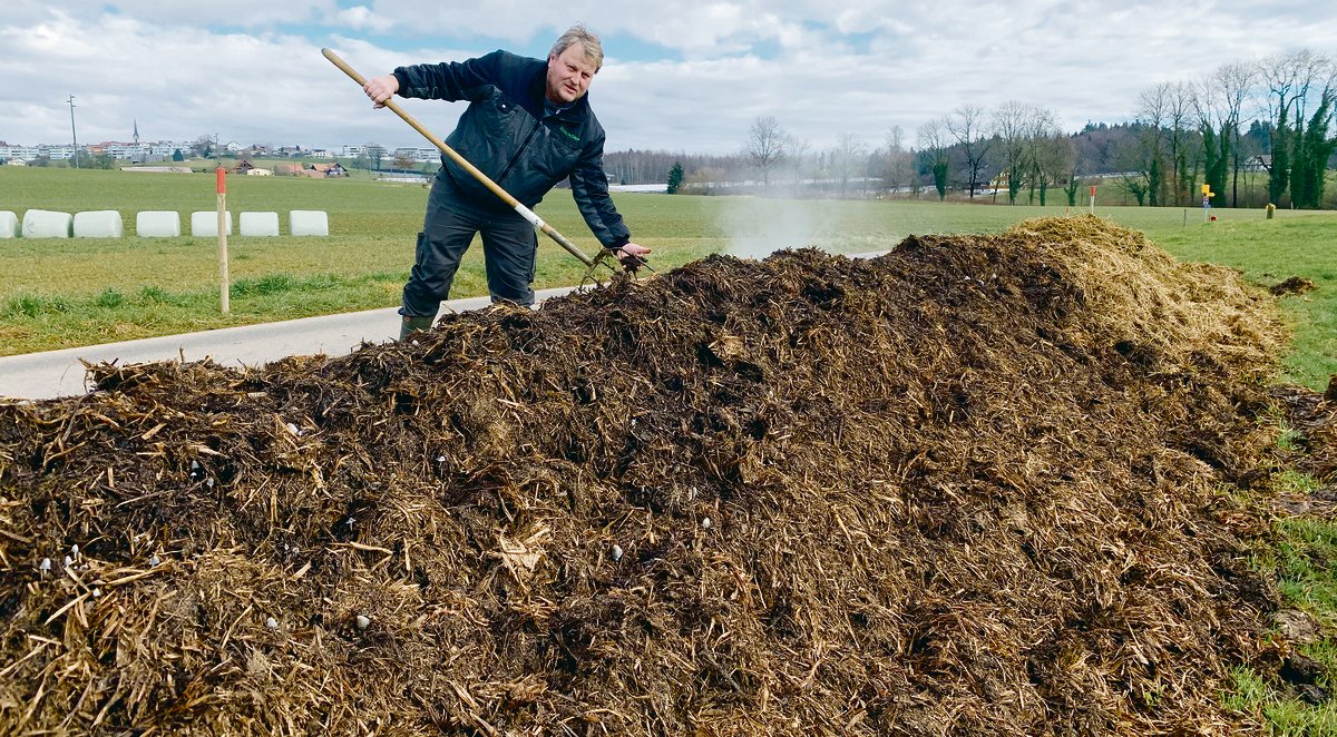 Seit einem Jahr wird aller Mist kompostiert und nur noch so auf die Böden ausgebracht. Durch das Kompostieren des anfallenden Mists entstehe ein bodenverträglicher Dünger für die Kulturen, zudem würden so im Boden grosse Mengen Mikroben in Form von Bakterien und Pilzen genährt.
