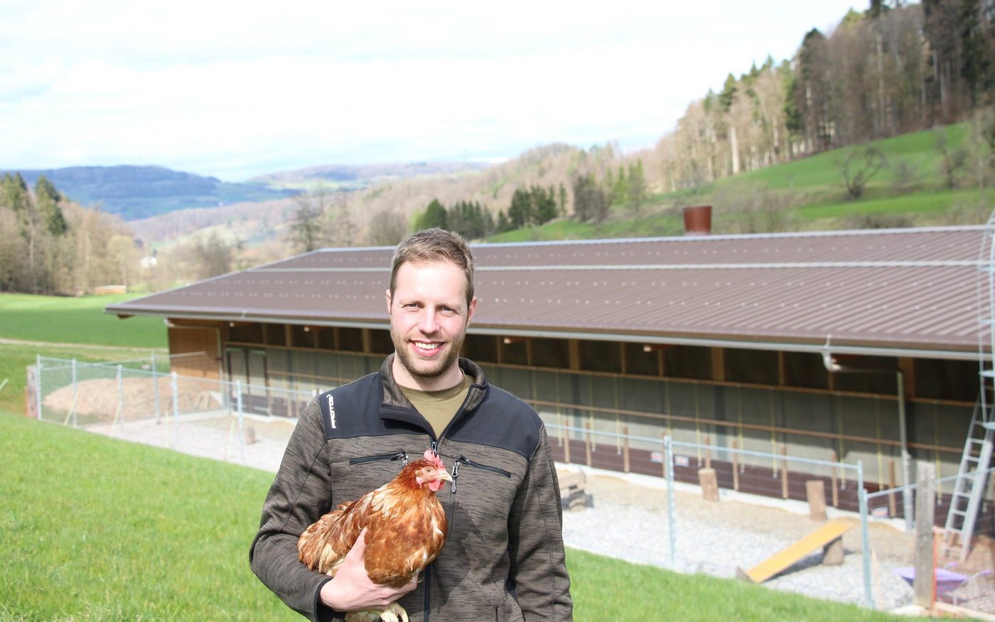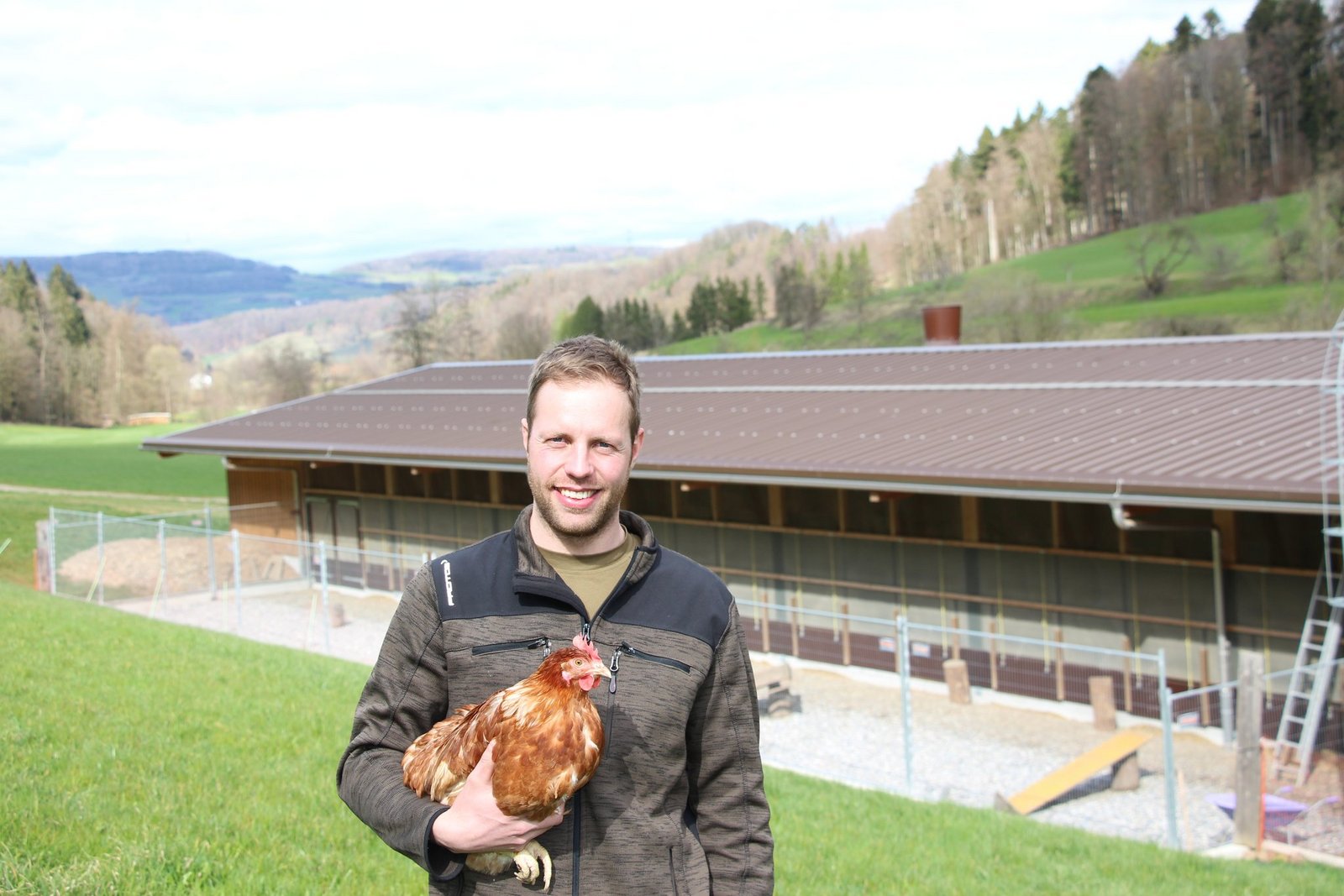 Seine Mutter Beatrice stellte den ursprünglichen Milchwirtschaftsbetrieb 2019 auf Bio um, 2020 übernahm ihr Sohn Raphael den Hof und plante mutig einen neuen Legehennenstall für 2000 Legehennen. Ein Liefervertrag mit der Ei AG SEG-Zürich/Basel gab ihm die nötige Sicherheit. Im Juni 2021 zogen 2000 Bio-Junghennen in den Neubau ein.