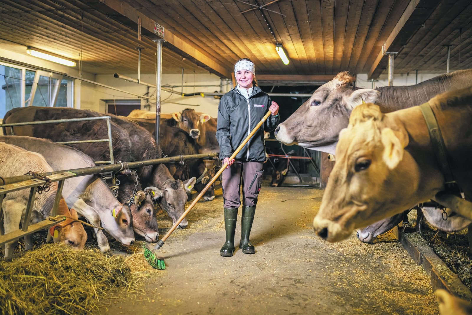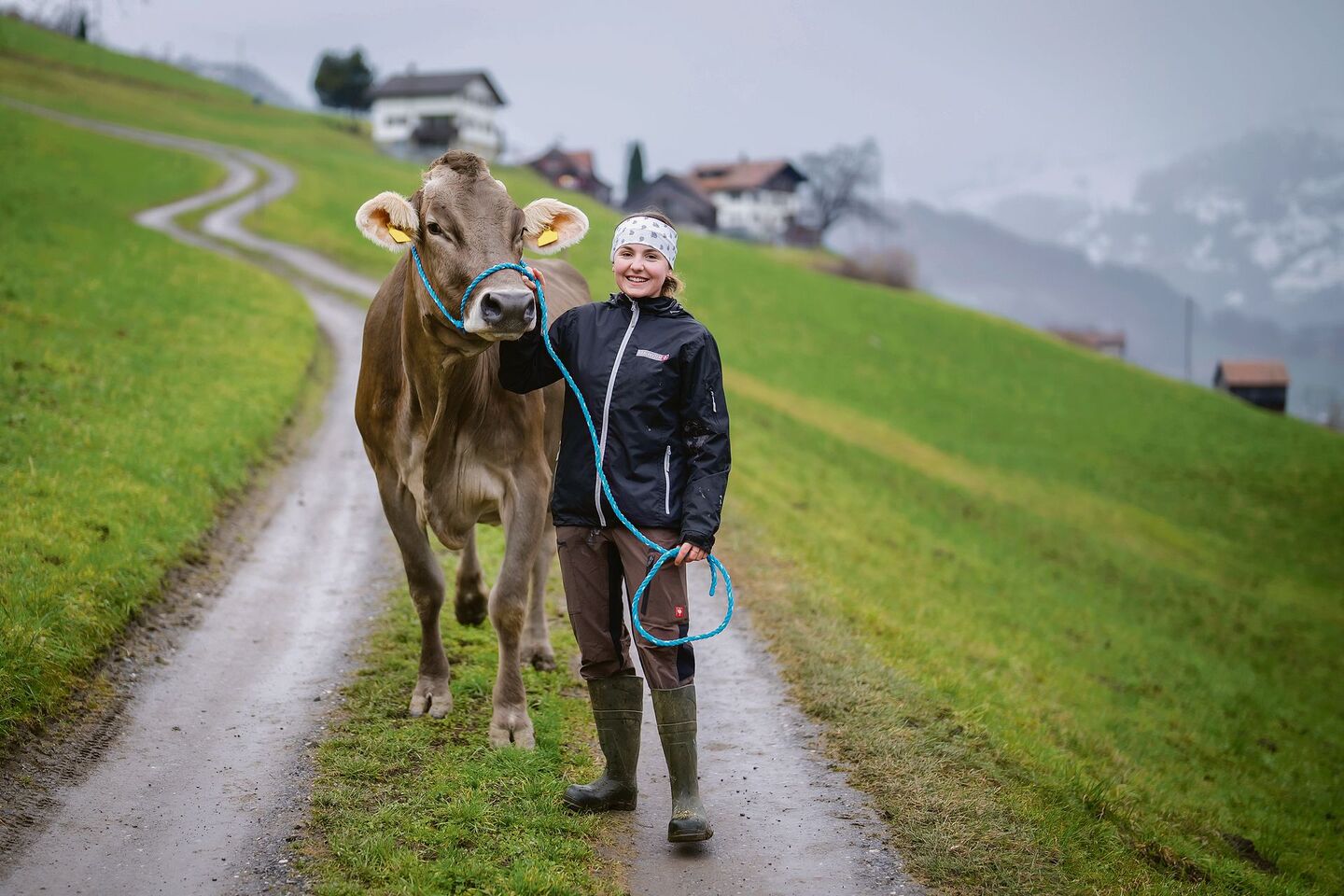 «Wir haben immer schon Braunvieh gehalten und gezüchtet», sagt die Flumserin und schiebt ihr weisses Stirnband zurecht. Ihre Familie bewirtschaftet im Nebenerwerb einen Betrieb mit Brown-Swiss-Kühen am Kleinberg über Flums. Vater Ruedi arbeitet selbständig als Stahlbaumonteur, die Aufgaben auf dem Hof erledigt die vierköpfige Familie gemeinsam.