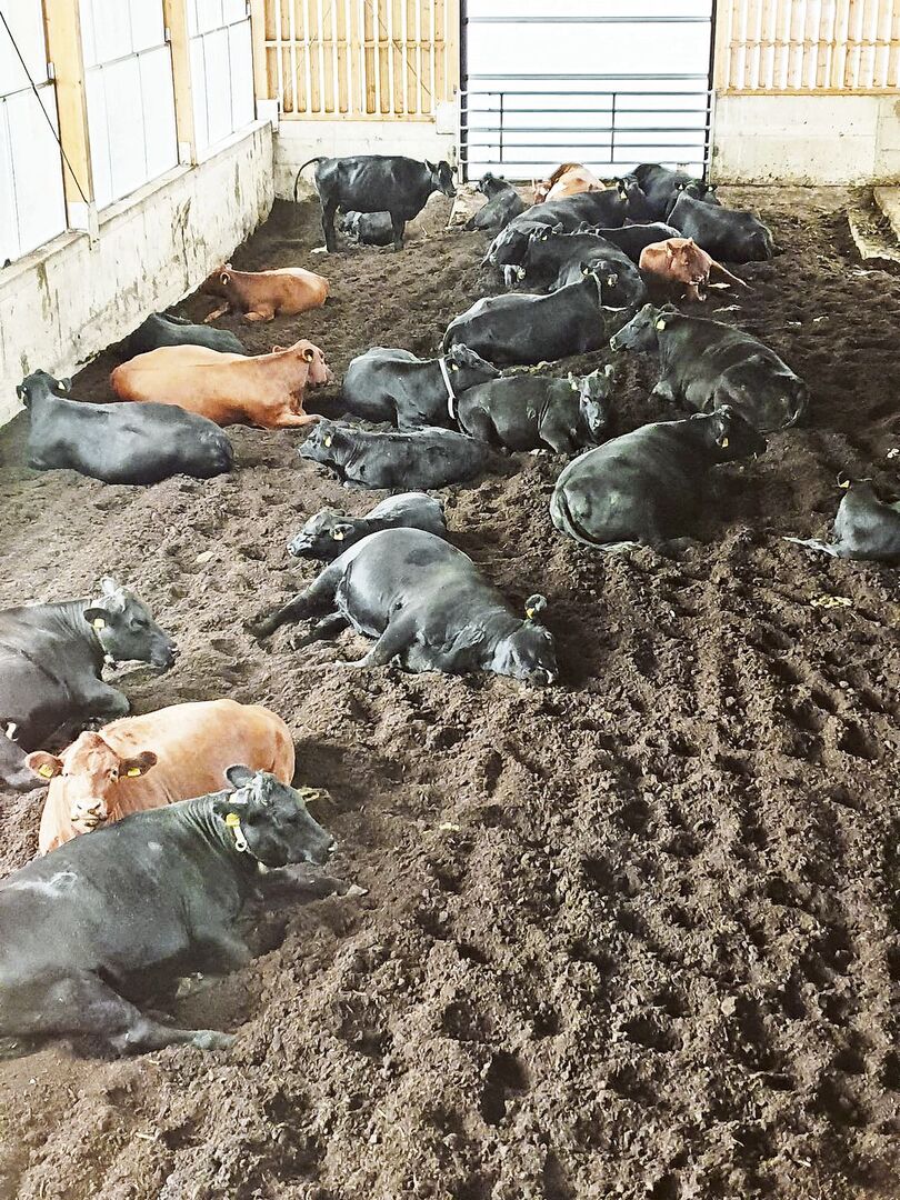 Das Eggen der Liegefläche nimmt täglich 10 bis 15 Minuten Zeit in Anspruch, die Kühe sind währenddessen im Fressgitter. Der Tierarzt ist auf dem Hubihof ein seltener Gast. «Unsere Tiere haben keine Gelenkprobleme und genug Platz, um einander auszuweichen», gibt der Landwirt zu bedenken. Das Gehen auf der tiefen Einstreu fordert die kurzbeinigen Angus und Wagyu im positiven Sinn, denn sie sind dadurch gut bemuskelt. Zudem sind die Tiere sauber, da die Einstreu nicht klebt. Bei frisch geborenen Kälbern sieht das anders aus, was der Grund ist für das Stroh in der Abkalbebox.
