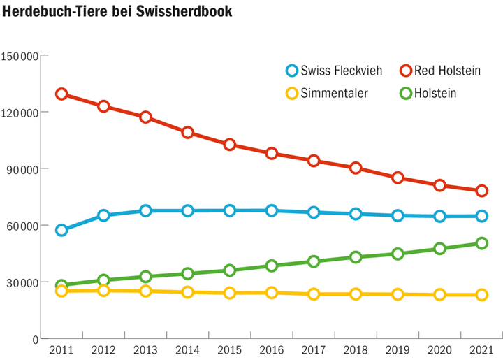 Die Simmentalerkuh befindet sich auf den Schweizer Milchviehbetrieben zwar im Abwärtstrend, hat aber deutlich tiefere Rückgänge zu verzeichnen als andere rote Rassen. So befindet sich beispielsweise Red Holstein regelrecht im Sinkflug. Während vor zehn Jahren noch beinahe 130 000 RH-Tiere im Herdebuch von Swissherdbook eingetragen waren, ist der Bestand 2021 auf unter 80 000 Tiere gesunken.