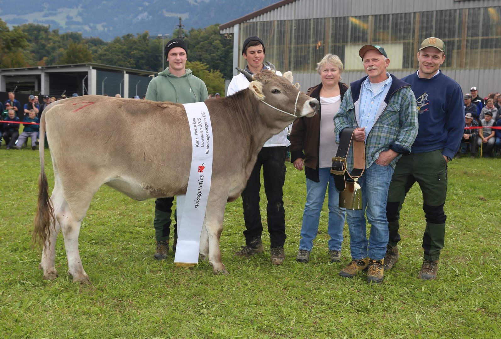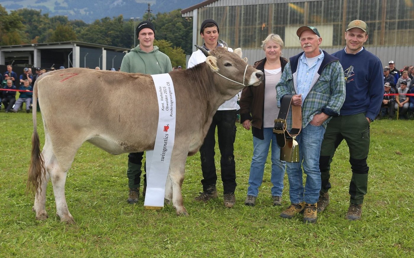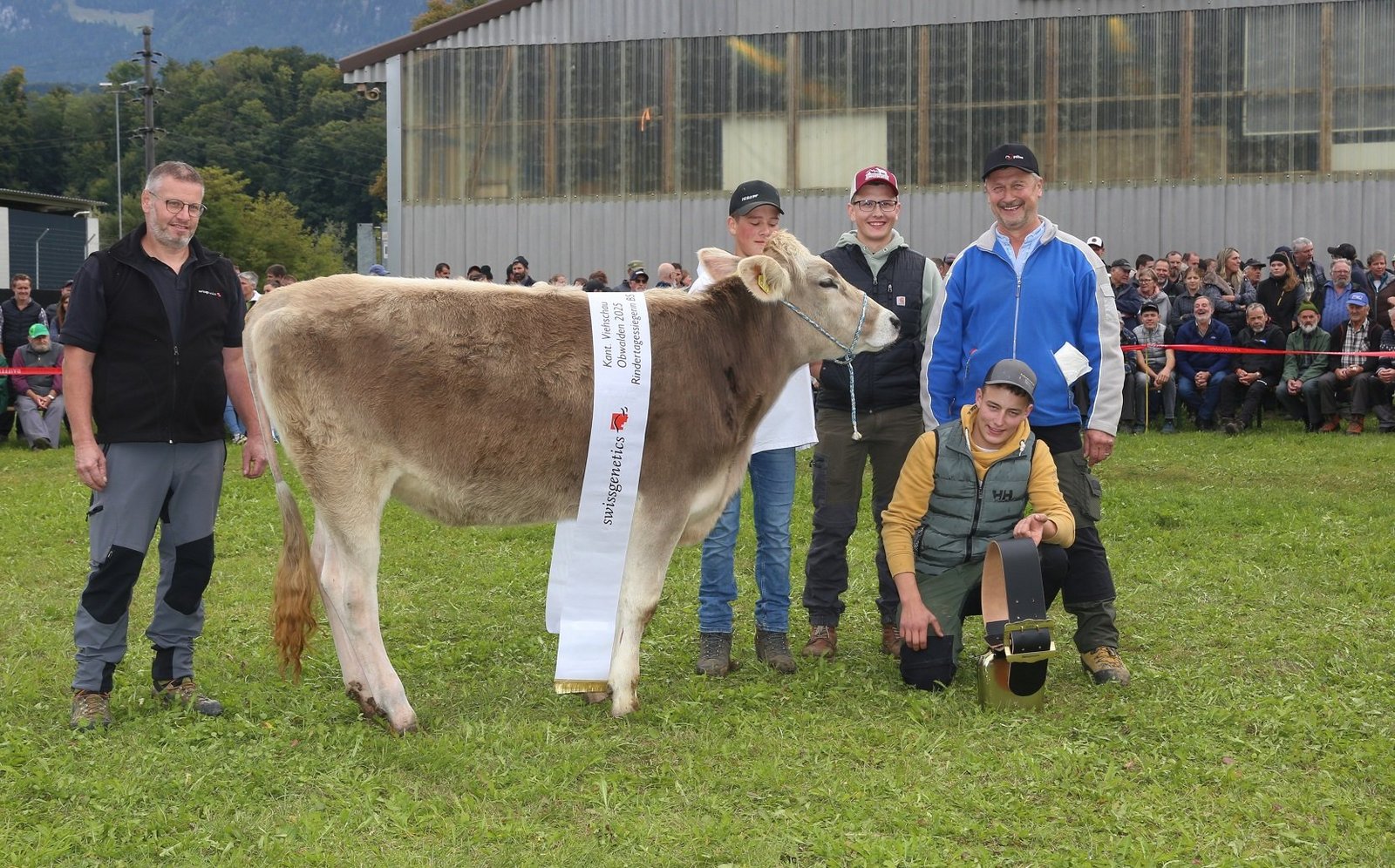 Gross war die Freude auch bei Familie Ettlin-Abächerli aus Kerns OW, nachdem ihr Jungtier Belinda zur Rindermiss OB gekürt wurde. Freude und Stolz waren beim Erfolg von Belinda mehr als berechtigt, denn sowohl ihre Mutter Materazzi-Maya als auch ihr Vater Harlei-Booster stammen aus der Zucht von Familie Ettlin-Abächerli.