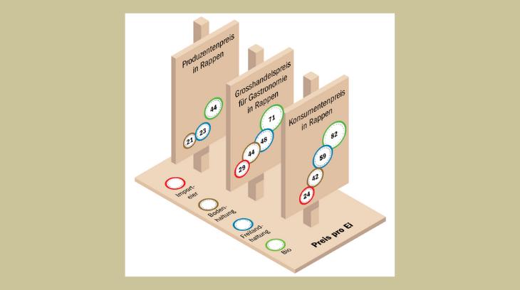 Den Konsumenten kostet ein Import-Ei nur rund die Hälfte eines Schweizer Eies. Gut dreimal mehr kostet ihn das heimische Bio-Ei. Der Landwirt bekommt für das Bio-Ei nur rund das Doppelte, verglichen mit dem Ei aus Bodenhaltung. Vom Hühnerstall bis zur Kasse des Einkaufsladens verdoppelt sich der Preis eines Eies in etwa. Würden auch die 866 Mio Eier aus Boden- und Freilandhaltung mit entsprechendem Mehraufwand biologisch produziert, ergäben sich für die Landwirtschaft Mehreinnahmen von 182 Millionen Franken.