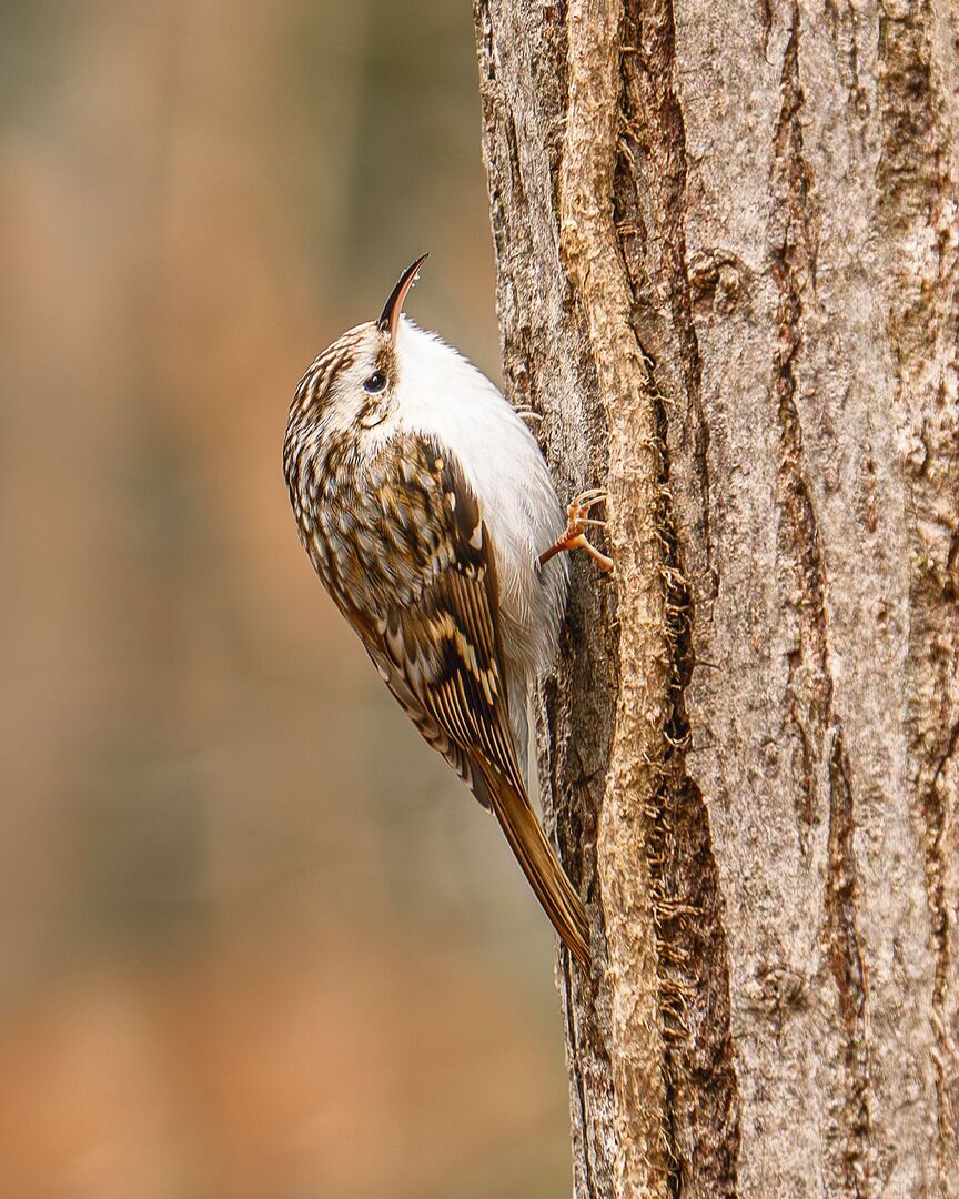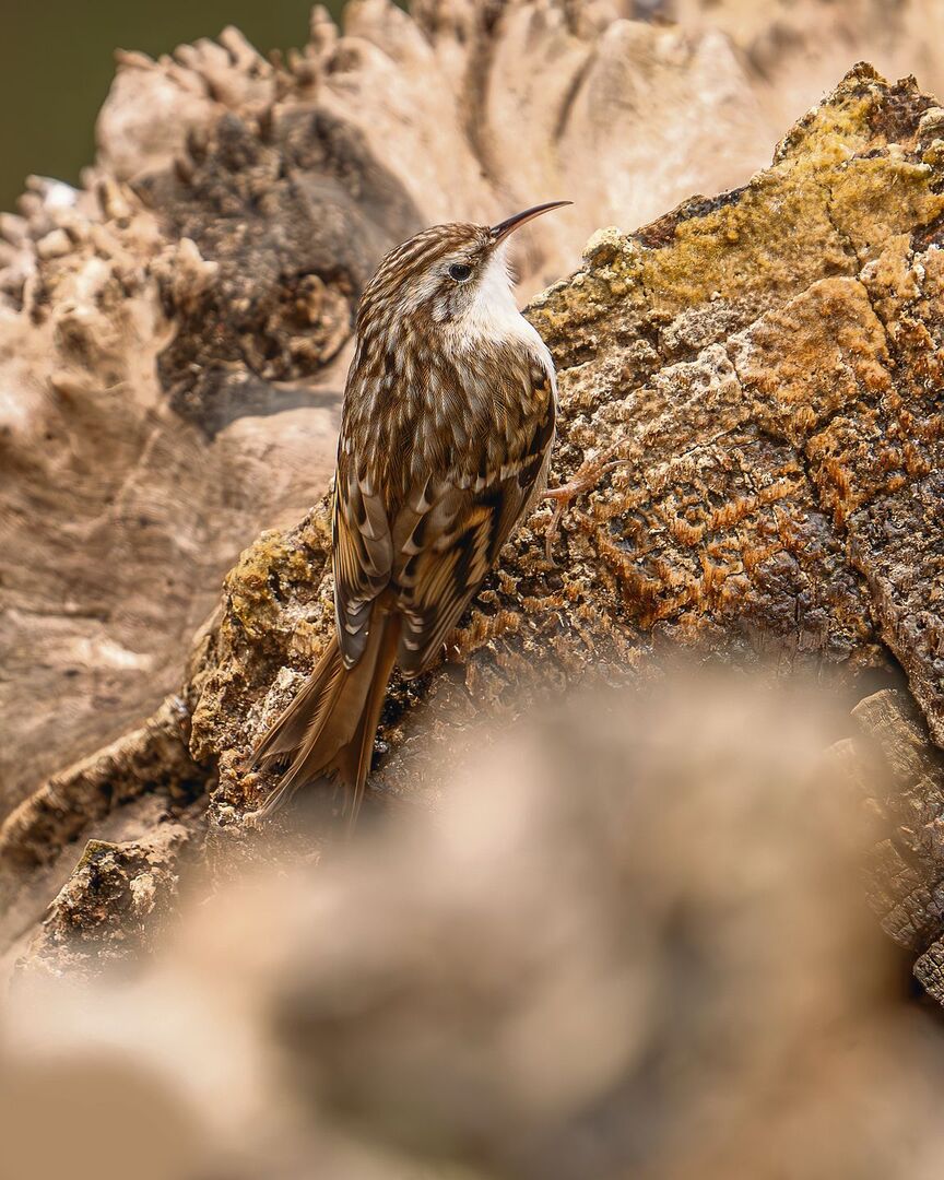 Bei den Bildern auf dieser Seite dürfte es sich um einen Waldbaumläufer handeln, schätzt Livio Rey. «Dafür sprechen der relativ kurze Schnabel und die reinweisse Unterseite sowie einige Gefiedermerkmale.» Bis zu drei Kilometer sollen die 12 bis 14 cm kleinen Vögel täglich kletternd zurücklegen, immer auf der Suche nach Nahrung. Dabei helfen ihnen eine lange Hinterkralle am Fuss und die steifen Schwanzfedern. Damit können sie sich wie Spechte am Stamm abstützen, was die Federn allerdings auf Dauer in Mitleidenschaft zieht und sie mit näher rückendem Mausertermin etwas verrupft aussehen lässt. «Waldbaumläufer ernähren sich ausschliesslich von kleinen Insekten und anderen Wirbellosen», führt der Ornithologe aus. Auch im Winter, den die Art in der Schweiz verbringt, gibt es keinen Nahrungswechsel auf Samen oder Körner. In der kalten wie der warmen Jahreszeit gelingt es den Baumläufern, mit ihrem schmalen, gebogenen Schnabel Beute aus der Rinde borkiger Bäume oder aus stehendem Totholz zu fischen.