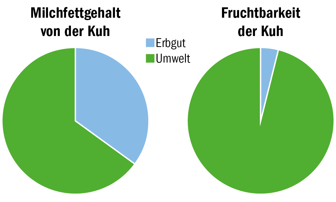 Die Leistung eines Tieres wird zum einen durch Umweltfaktoren wie Fütterung, Haltung, Betriebsstandort etc. beeinflusst und zum anderen durch das Erbgut. Welcher Anteil genetisch bedingt ist, ist von Merkmal zu Merkmal unterschiedlich. Bei Merkmalen, die vermehrt vom Erbgut beeinflusst werden, ist die Schätzung vom Zuchtwert einfacher und genauer. Dadurch sind diese Merkmale züchterisch einfacher zu verbessern. Gesundheit, Fruchtbarkeit und Nutzungsdauer sind Merkmale die stark von der Umwelt beeinflusst werden, weshalb züchterisch nur kleine Fortschritte zu erreichen sind.