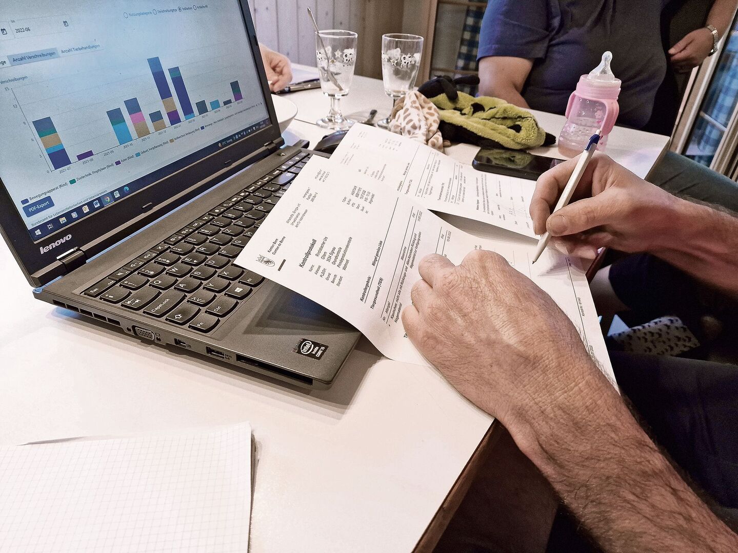 Valerie Wist hat bei ihrem Besuch bei der Familie Rindisbacher den Ausdruck aus Abidat dabei. Stichprobenartig vergleicht sie die Eintragungen aus dem Behandlungsjournal mit den Daten aus Abidat. Die Primärproduktionskontrolle sei eine gute Gelegenheit, zu Abidat und den darauf erfassten Daten ins Gespräch zu kommen. Auch Urs Rindisbacher hat sich zuvor noch nie auf der Datenbank, die über das Agate-Login erreichbar ist, «umgesehen». «Es ist interessant, das in dieser Darstellung einmal zu sehen», sagt der Landwirt zum Säulendiagramm aus dem er entnehmen kann, in welchen Monaten und für welche Beschwerden Antibiotika zum Einsatz kamen.