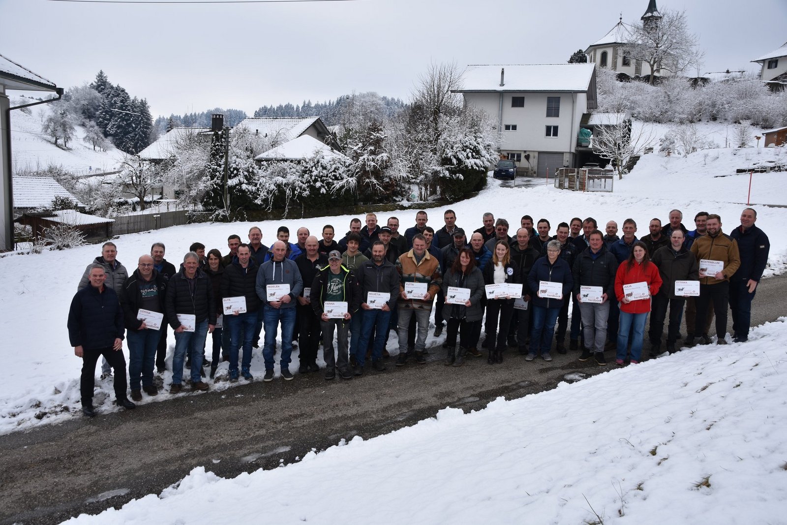 Ruedi Sommer, Präsident des Emmentalischen Fleckviehzuchtverbands, wies in seinem Jahresrückblick auf die vielen Schauerfolge seiner Mitglieder hin. Mit der Starparade vom Freitag, 21. Februar (abends mit den Jungzüchtern) und am Sonntag, 23. Februar (mit den Kühen) steht schon bald ein nächster Höhepunkt an. Dieses Jahr am 6. September findet zudem in Schüpbach auch die Emmentalische Verbandsschau wieder statt. Dass das Emmental ein starkes Zuchtgebiet ist, zeigt sich nicht nur an den zwei Auktionen in Burgdorf und in Schüpbach, sondern auch an den vielen 100'000er-Kühen die jedes Jahr an der DV geehrt werden können. Dieses Jahr waren es deren 52 Kühe mit ihren Züchterinnen und Züchter, die von Swissherdbook-Präsidenten Markus Gerber und dessen Direktor Michel Geinoz einen Plakette überreicht bekamen.