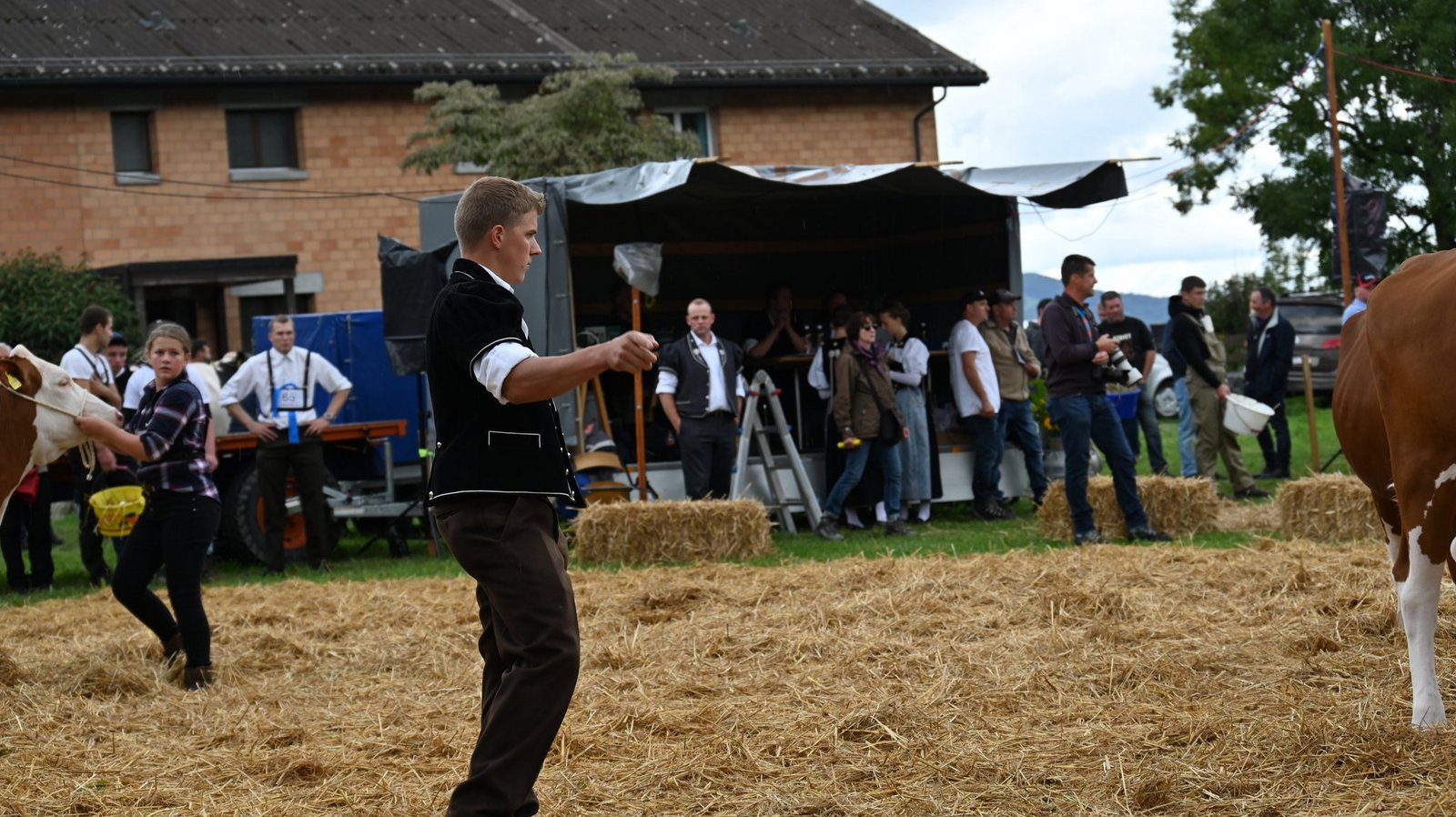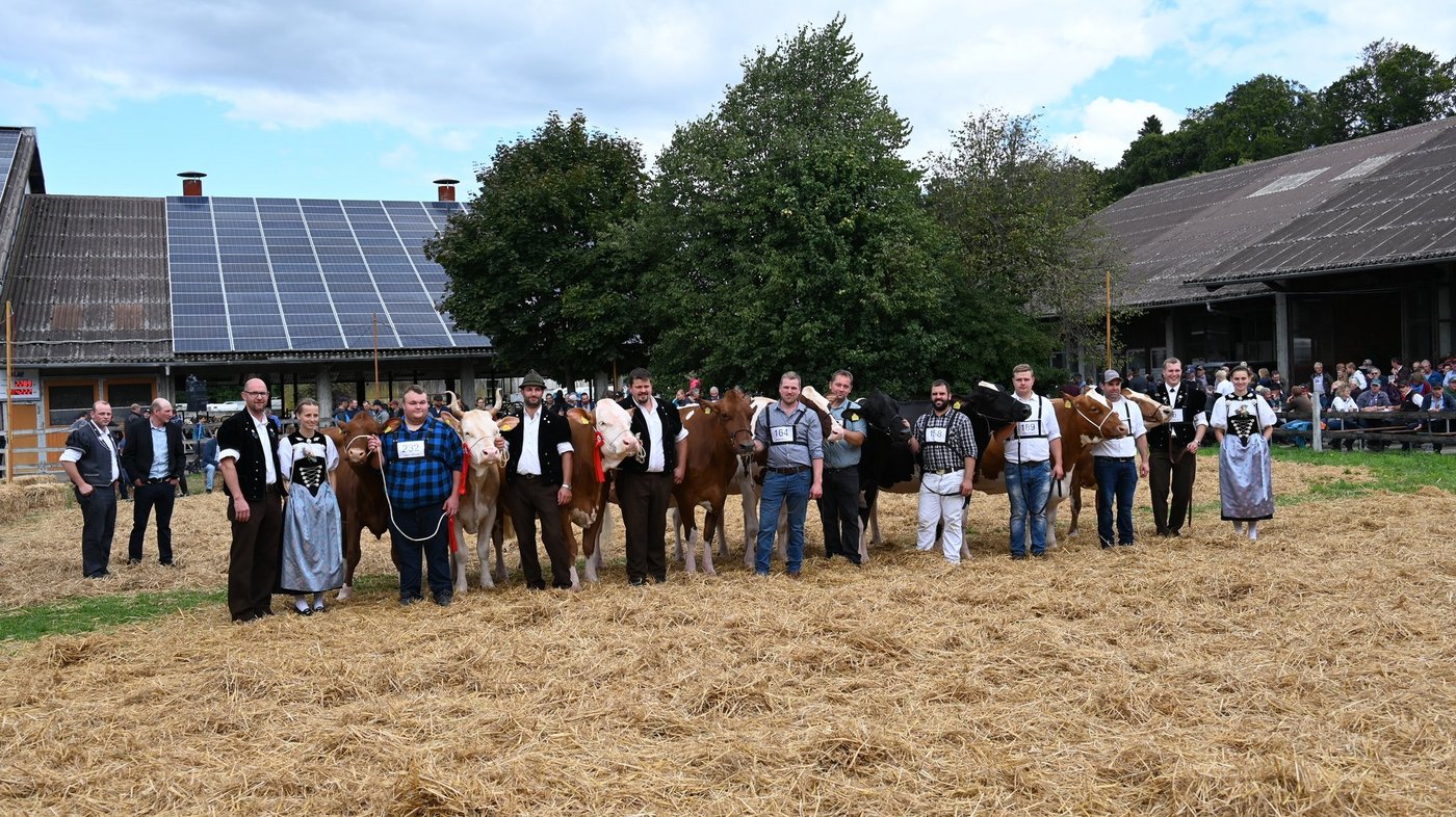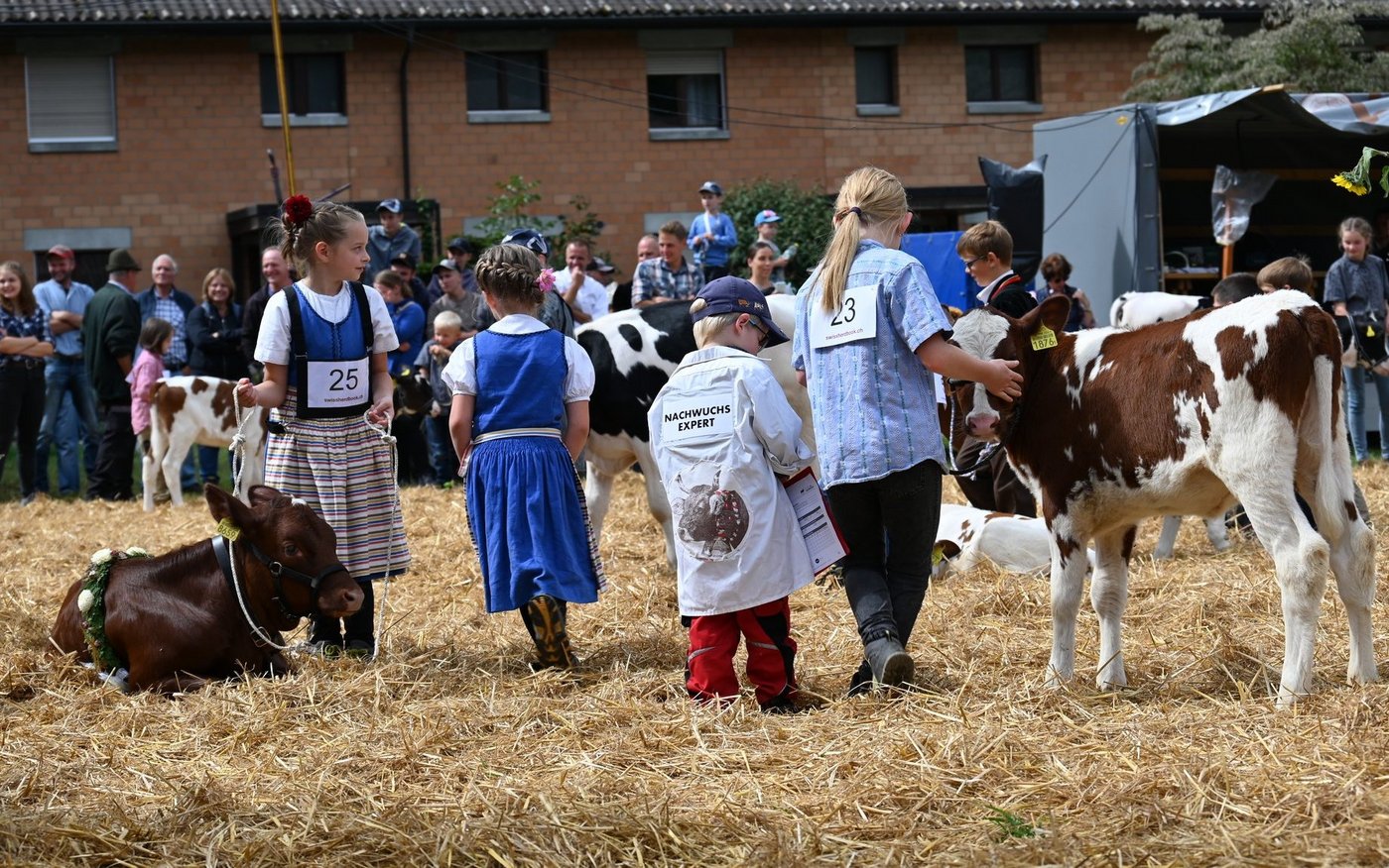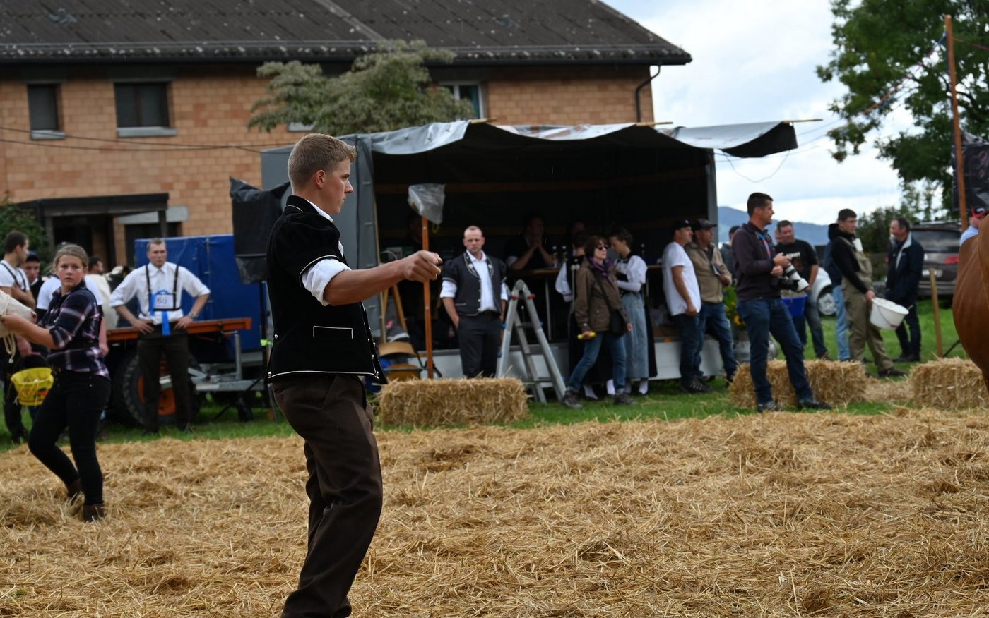 Die Emmentalische Verbandsschau findet nur alle drei Jahre und immer an einem anderen Ort statt. Kurz vor Beginn des diesjährigen Anlasses meint es Petrus nicht gut und öffnet kräftig die Schleusen. Als dann die Tiere der ersten beiden zu richtenden Kategorien zu «Atemlos» von Helene Fischer die Ringe betreten, hat der Regen schon merklich nachgelassen. Damit das Tagesprogramm eingehalten werden und die Kühe pünktlich zur Melkzeit wieder in den heimischen Stall zurückkehren können, werden die Tiere gleichzeitig in zwei Ringen gerichtet. Bruno Beyler ist zuständig für die Rassen Simmental (SI) und Swiss Fleckvieh (SF), während Christian Stegmann die Red Holstein- (RH) und Holstein-Kühe (HO) rangiert. Für das Richten der Rinder ist Martin Bergmann, Abländschen, zuständig. [IMG 15]
