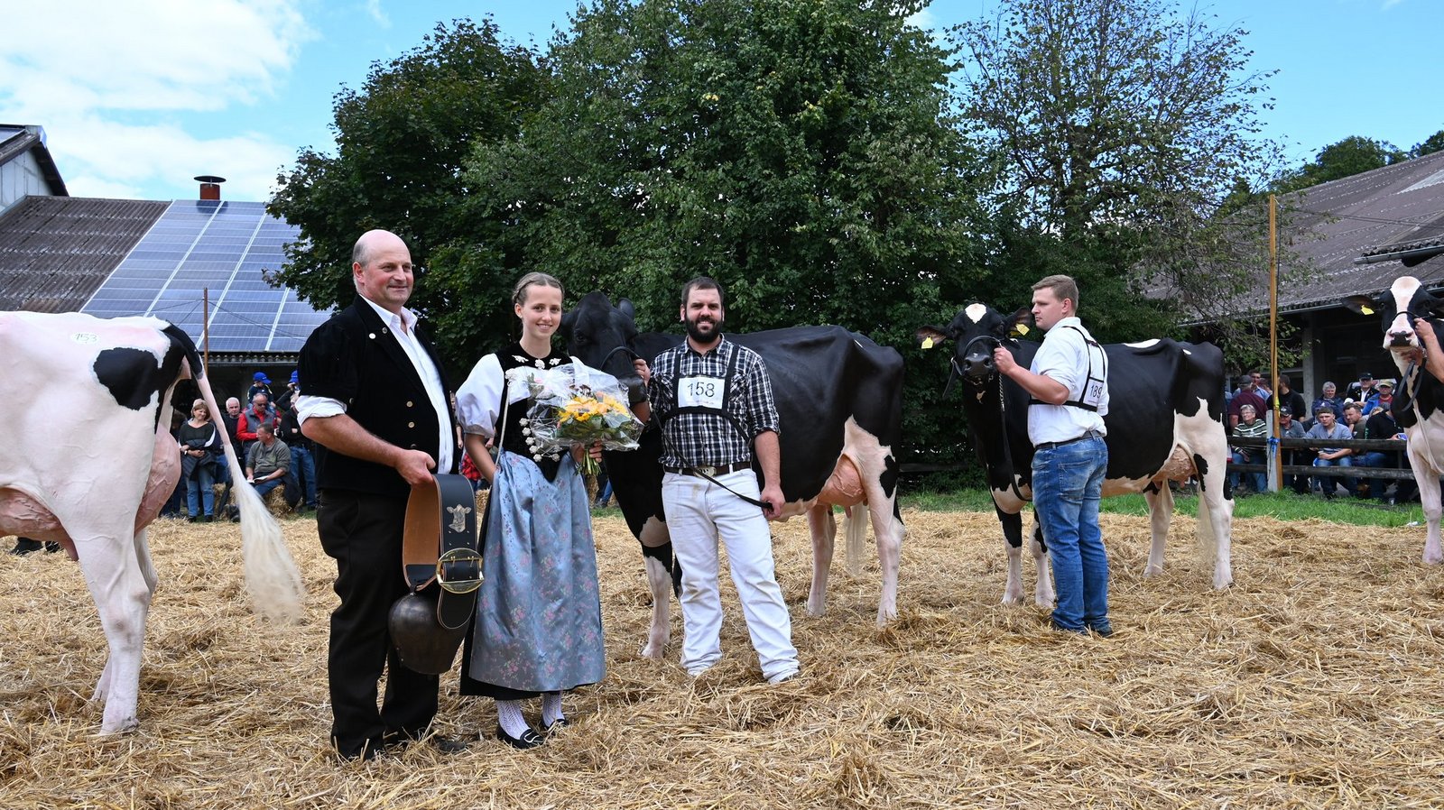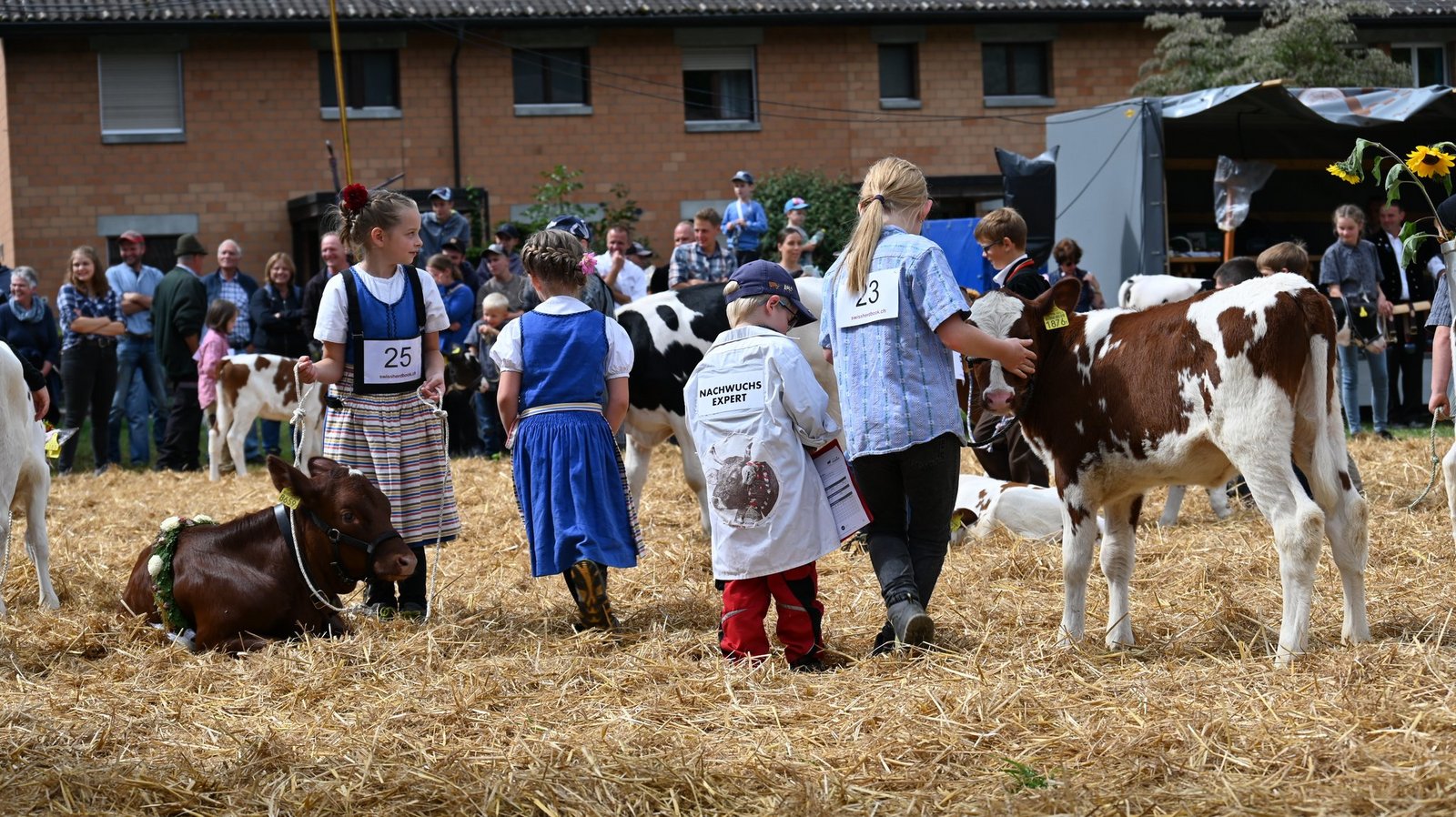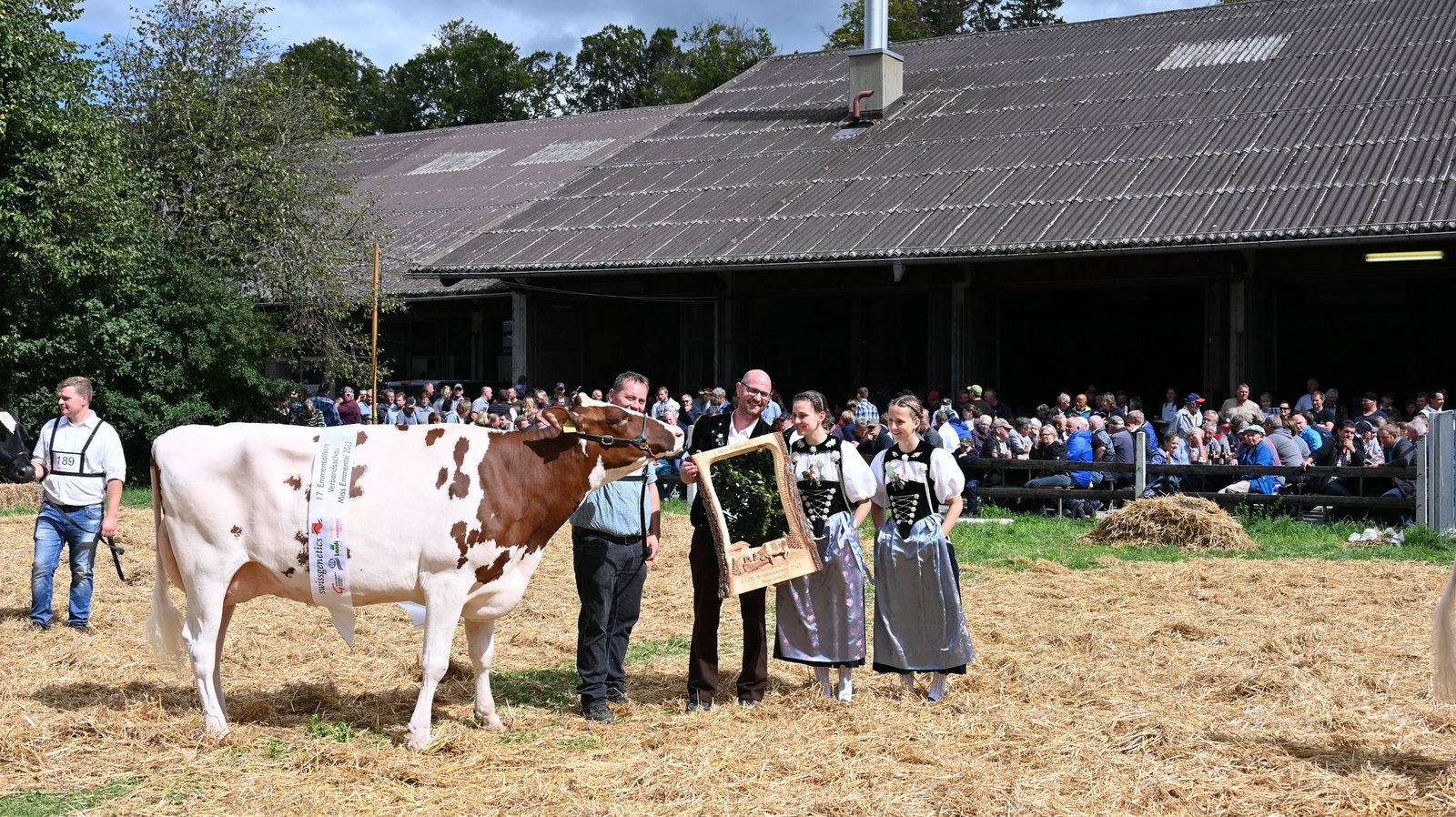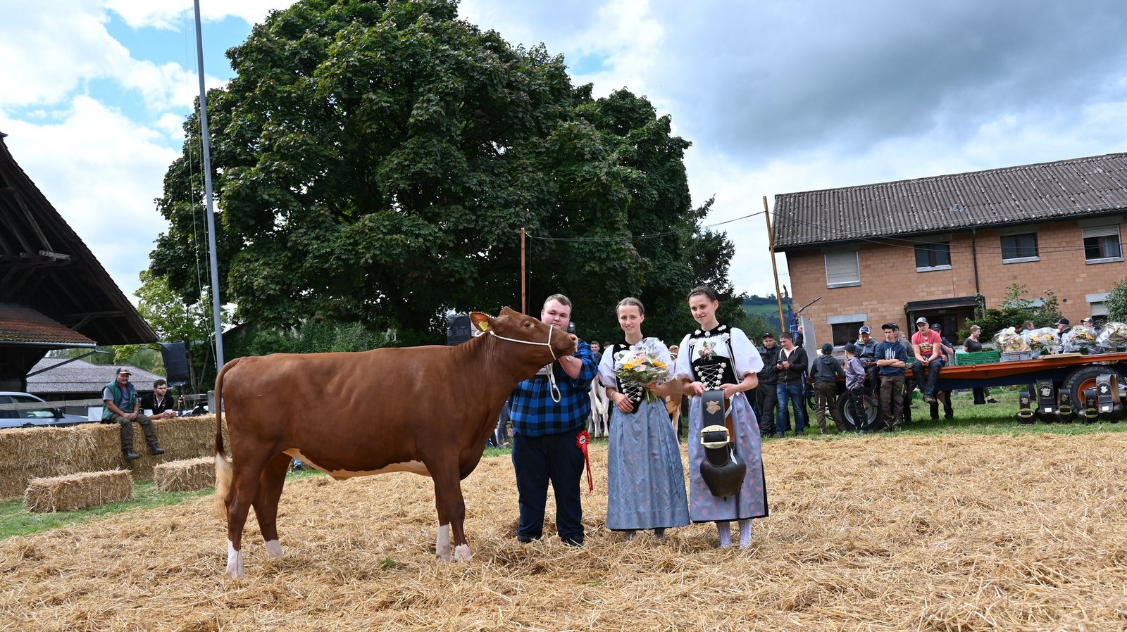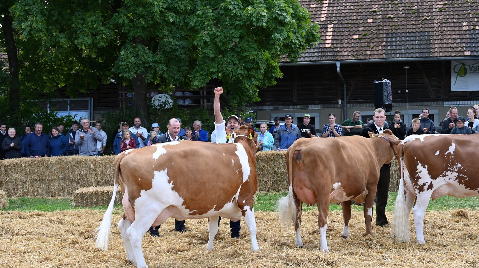 Die Emmentalische Verbandsschau findet nur alle drei Jahre und immer an einem anderen Ort statt. Kurz vor Beginn des diesjährigen Anlasses meint es Petrus nicht gut und öffnet kräftig die Schleusen. Als dann die Tiere der ersten beiden zu richtenden Kategorien zu «Atemlos» von Helene Fischer die Ringe betreten, hat der Regen schon merklich nachgelassen. Damit das Tagesprogramm eingehalten werden und die Kühe pünktlich zur Melkzeit wieder in den heimischen Stall zurückkehren können, werden die Tiere gleichzeitig in zwei Ringen gerichtet. Bruno Beyler ist zuständig für die Rassen Simmental (SI) und Swiss Fleckvieh (SF), während Christian Stegmann die Red Holstein- (RH) und Holstein-Kühe (HO) rangiert. Für das Richten der Rinder ist Martin Bergmann, Abländschen, zuständig. [IMG 15]