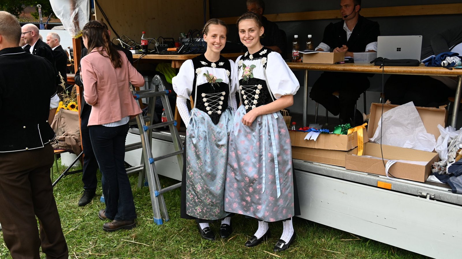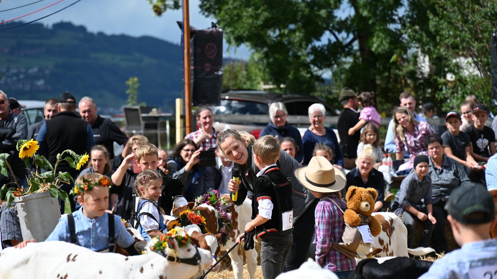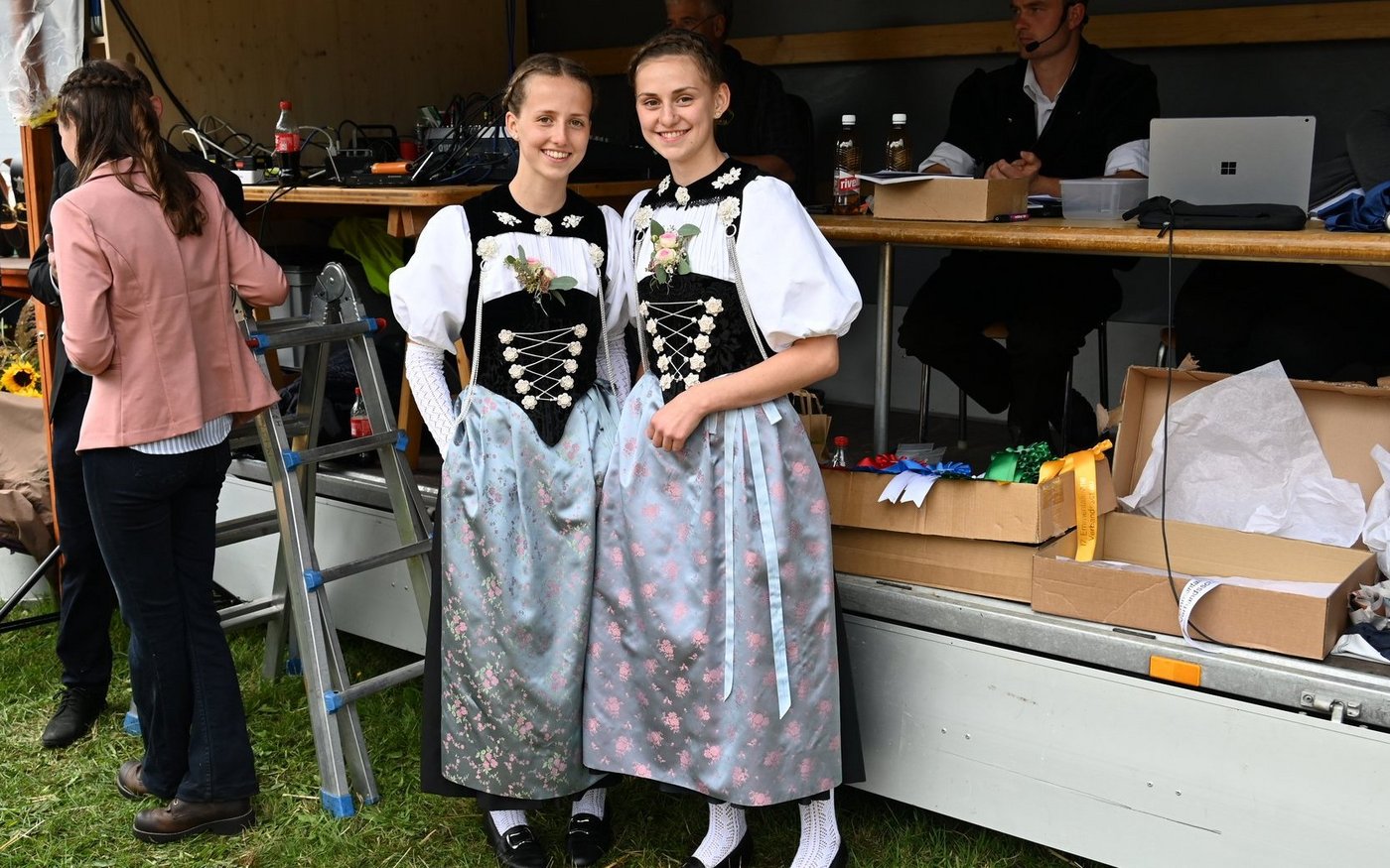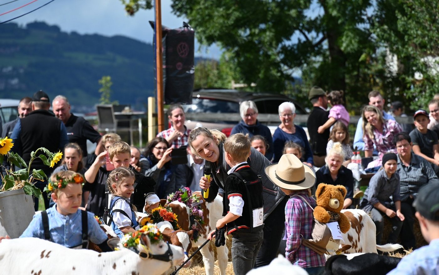Die Emmentalische Verbandsschau findet nur alle drei Jahre und immer an einem anderen Ort statt. Kurz vor Beginn des diesjährigen Anlasses meint es Petrus nicht gut und öffnet kräftig die Schleusen. Als dann die Tiere der ersten beiden zu richtenden Kategorien zu «Atemlos» von Helene Fischer die Ringe betreten, hat der Regen schon merklich nachgelassen. Damit das Tagesprogramm eingehalten werden und die Kühe pünktlich zur Melkzeit wieder in den heimischen Stall zurückkehren können, werden die Tiere gleichzeitig in zwei Ringen gerichtet. Bruno Beyler ist zuständig für die Rassen Simmental (SI) und Swiss Fleckvieh (SF), während Christian Stegmann die Red Holstein- (RH) und Holstein-Kühe (HO) rangiert. Für das Richten der Rinder ist Martin Bergmann, Abländschen, zuständig. [IMG 15]