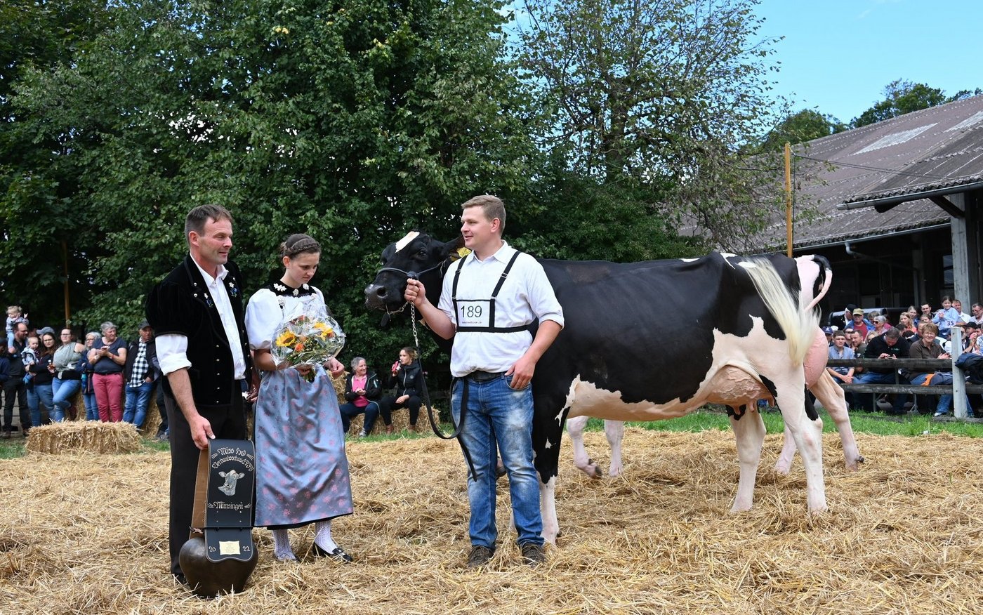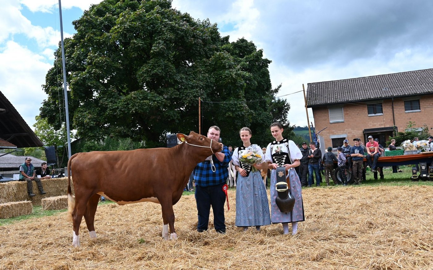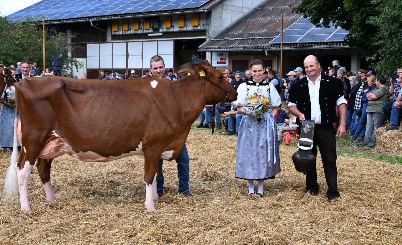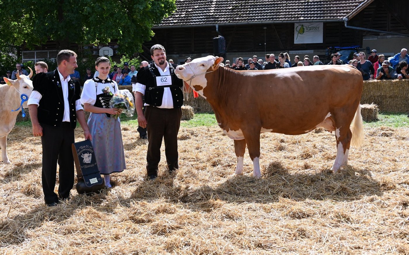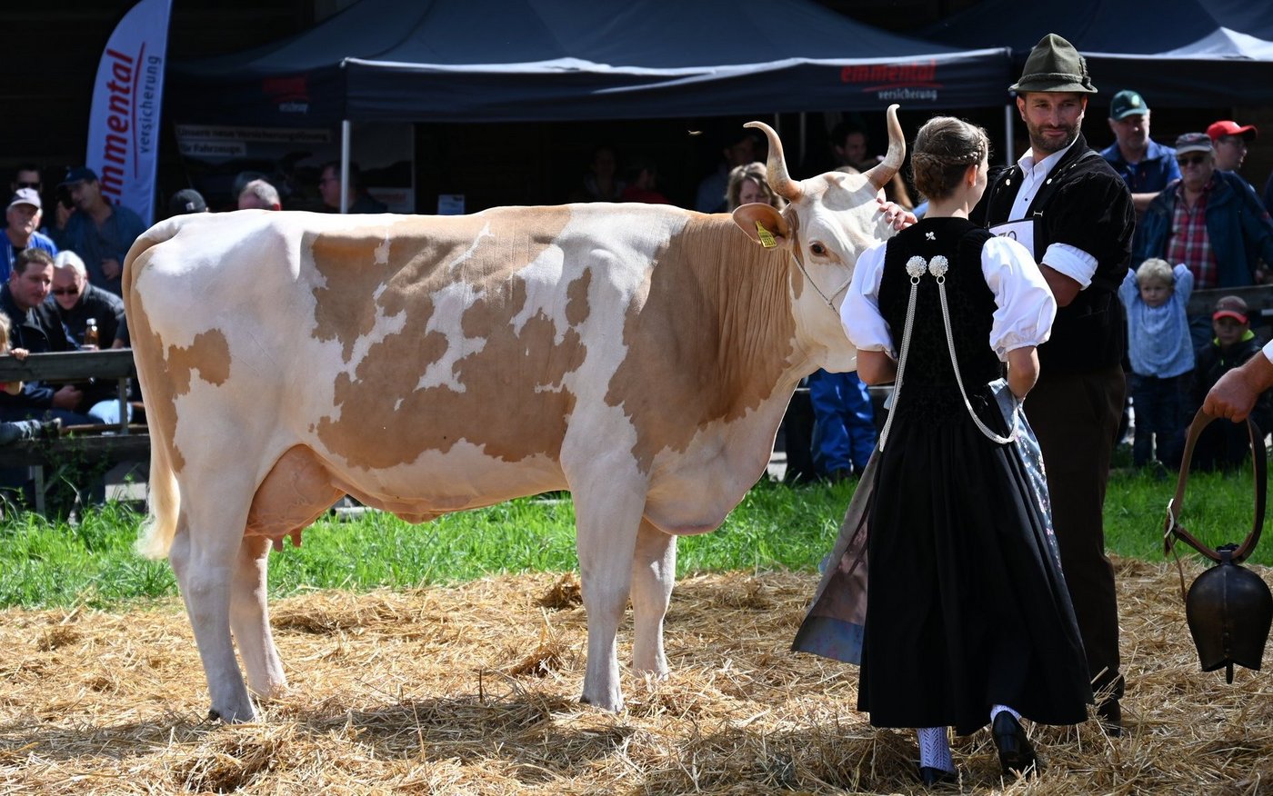 «Ein hammer Euter, enorm viel Ringpräsenz, eine Top-Kuh, eine sehr homogene Kategorie, eine sehr vorzügliche Kuh.»Die beiden Richter Christian Stergmann und Bruno Beyeler zeigen sich heute Samstag 10. September, an der Emmentalischen Verbandsschau auf dem Schwand in Münsingen begeistert. «Meine Erwartungen an die Qualität wurden gar übertroffen», betont Stegmann. Und Beyeler doppelt nach: «Die Emmentaler haben gezeigt, was sie zu bieten haben.» Damit könne national problemlos mitgehalten werden. Es fällt den beiden daher auch nicht leicht, die Miss Emmental zu bestimmen. Das Rennen macht schlussendlich Oberli`s Jordy Leonie von Beat Oberli, Süderen. Sie holte sich zuvor den Miss-Titel bei den Red-Holstein-Kühen. «Wir haben lange diskutiert und sind schlussendlich auf denselben Nenner gekommen», betont Bruno Beyeler. «Die Siegerin hat das gewisse Etwas mehr.» [IMG 13]