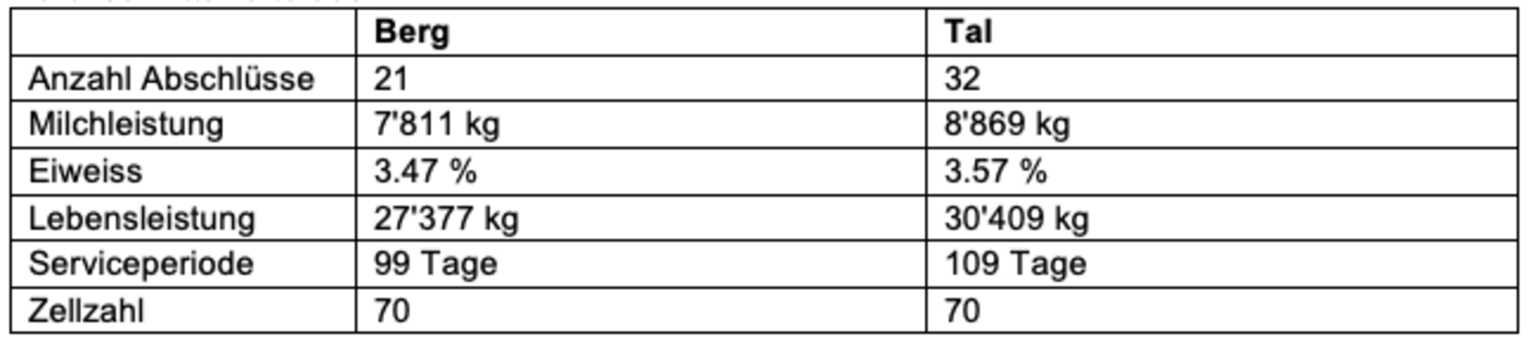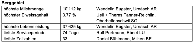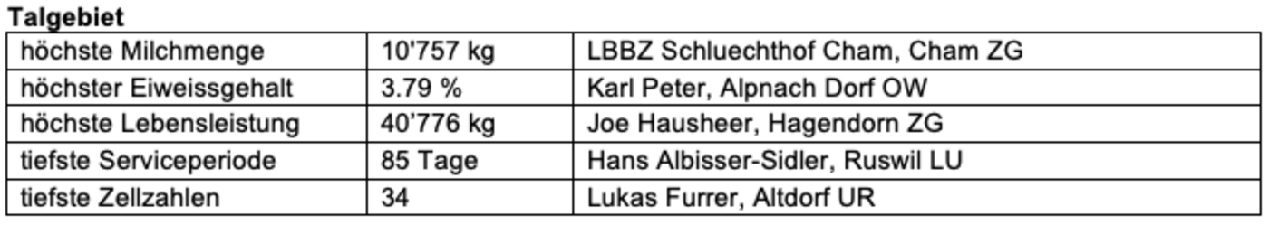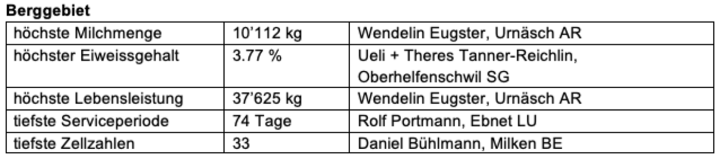 Jene Betriebe mit den höchsten Einzelwerten weist der Zuchtverband in einer eigenen Tabelle aus, jeweils sortiert nach Tal- oder Berggebiet: