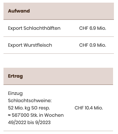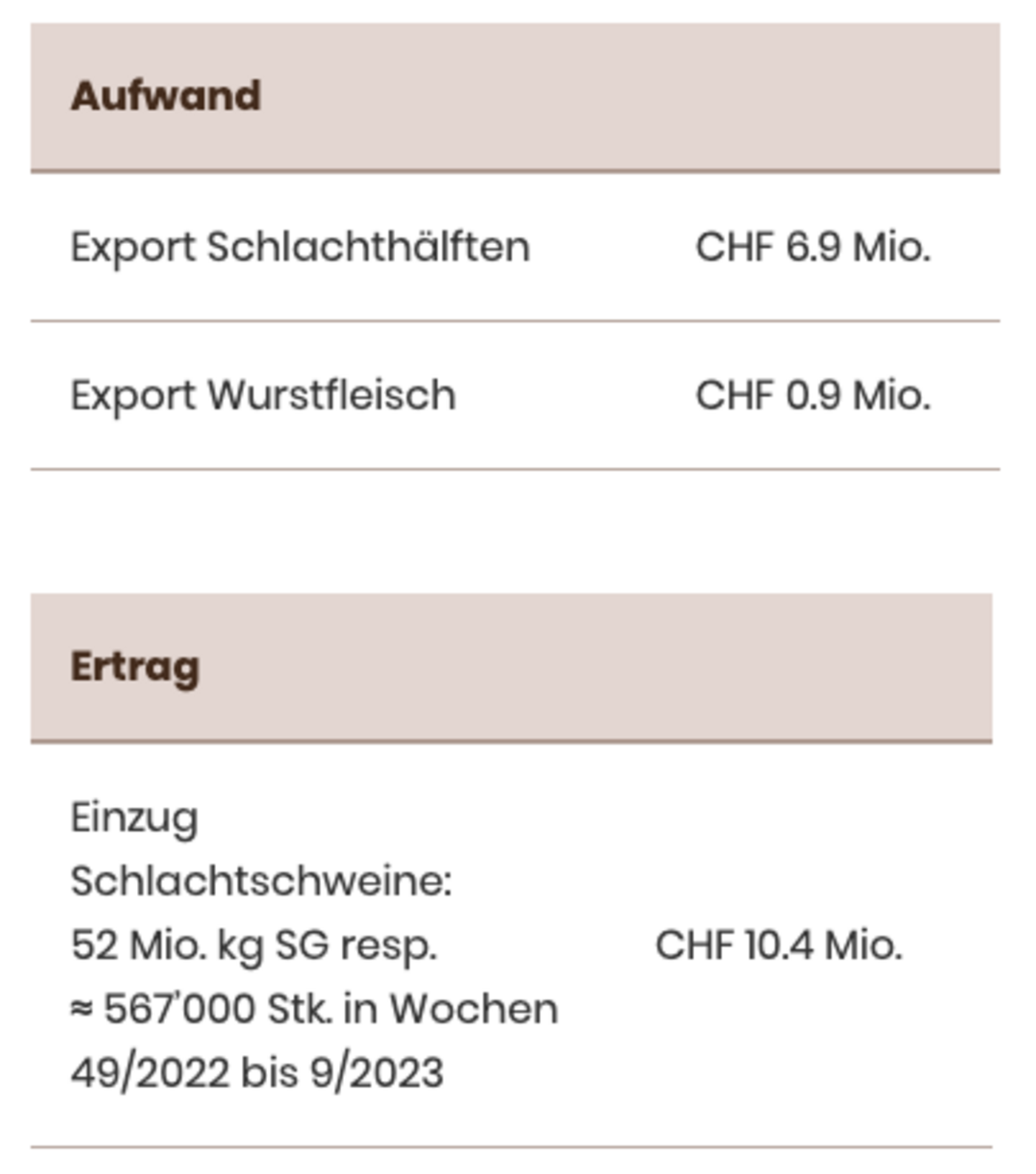 Zur Finanzierung des Exports von Schweinefleisch in den europäischen Raum wurde laut Proviande ein Fonds gebildet, welcher von den Schweinemästern und dem Handel ab dem 5. Dezember 2022 bis anhin mit rund 10,4 Millionen Franken gespiesen wurde. Es werde weiterhin noch Wurstfleisch exportiert und der Fonds anschliessend saldiert und aufgehoben, heisst es in der Mitteilung weiter.