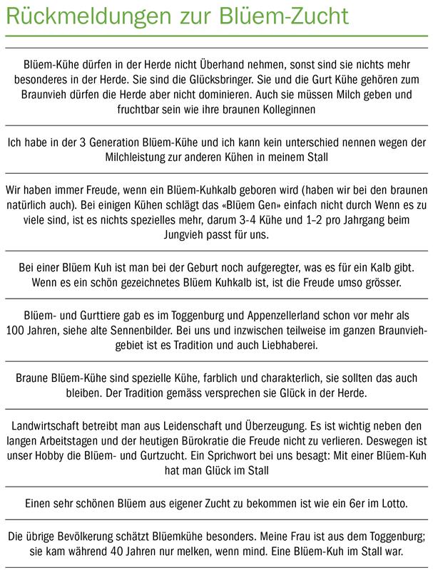 Bis 1997 war die Blüem-Kuh – obwohl genetisch eindeutig dem Braunvieh zugehörig – nicht herdebuchfähig. Erst durch den Druck aus der Praxis wurde sie aufgenommen. Ein entscheidender Durchbruch folgte 2012 mit der Identifikation des verantwortlichen KIT-Gens durch die Universität Bern – das sogenannte Blüem-Gen, das die charakteristische Zeichnung verursacht.
