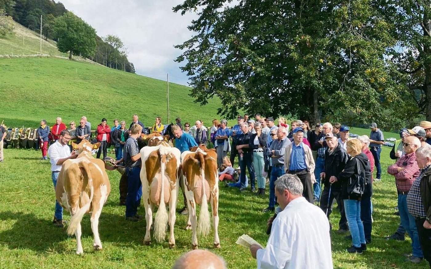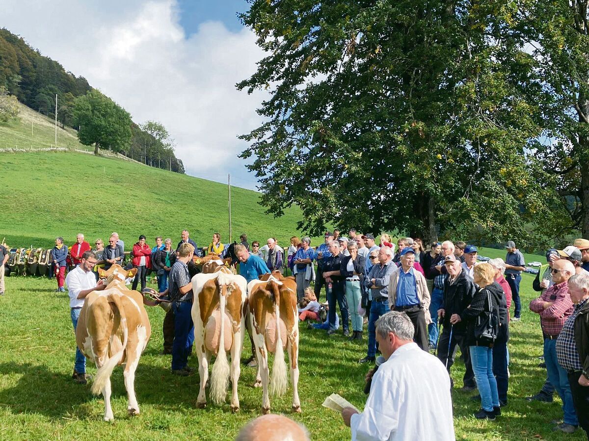 Bei der Auffuhr wurden die Züchter und ihre Tiere bei bestem Wetter und begleitet von Alphornklängen empfangen. Dank vielen Helferinnen und Helfern konnten sie ihre schön herausgeputzten Kühe den Experten vorführen. Die präsentierten Tiere der Rassen Simmental, Swiss Fleckvieh, Red Holstein und Holstein überzeugten durch hohe Qualität und entsprechend gut fielen die Benotungen aus. Bei der Rangierung erhielten die Siegerkühe eine Glocke umgehängt.