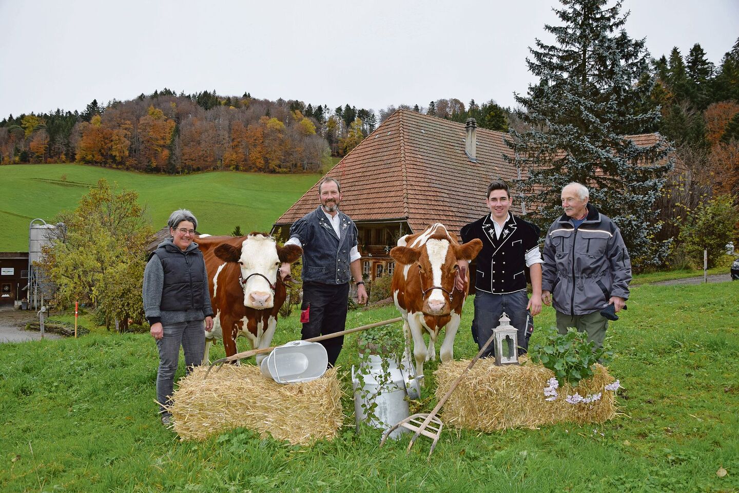 Es ist ein regnerischer Tag, an dem wir die Familie Urs und Susanne Bernhard auf ihrem Hof in Heimiswil besuchen. Eben noch schien die Sonne – jetzt regnet es wieder. Der Betriebsleiter steht mit seinem Sohn Nils schon vor dem Haus parat, und erst noch im Chüjermutz. Den auserwählten Platz, wo die beiden «Ladys» fotografiert werden sollen, hat die Familie wunderschön mit Strohballen, Melkkessel und Milchkanne dekoriert.