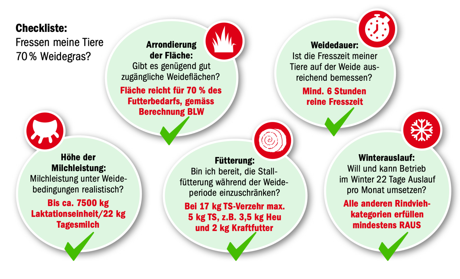 Das grosse Interesse am Programm Weidebeitrag, mit einer damit verbundenen regen Anmeldung, könnte sich allerdings noch ändern. Wie diese Woche anlässlich einer Tagung am Inforama Rütti in Zollikofen BE erinnert wurde, sind die Anforderungen an das Auslösen diese Beitrags hoch. Insbesondere die Aufnahme von 70 Prozent des Futters auf der Weide dürfte die Tierhalter dabei vor Herausforderungen stellen. Wer nicht erfüllt, sollte rasch abmelden.