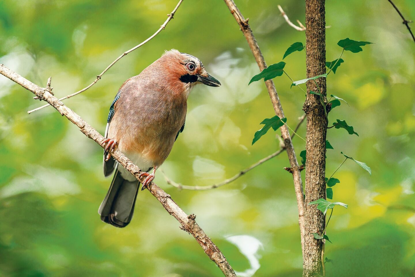 Lange beschreiben muss man den Eichelhäher nicht, es besteht kaum Verwechslungsgefahr mit anderen Vögeln. Auch wenn die Art zur Familie der Rabenvögel gehört, trägt sie ein rötlich-braun bis rosa gefärbtes Gefieder. Auffällig sind der schwarze Bartstreif, die befiederte Schnabelwurzel und die blau-schwarz gesteiften, kleinen Federn an den Flügeln. Eichelhäher sind in der Schweiz verbreitet und nicht gefährdet. Die Chancen stehen also nicht schlecht, sie zu sehen, ihre Warnrufe zu hören oder eine ihrer blauen Federn beim Waldspaziergang zu finden.