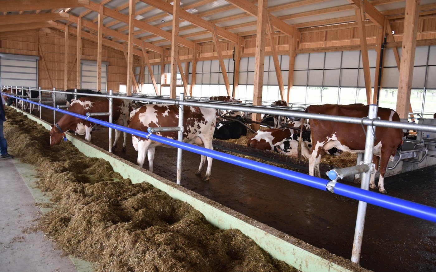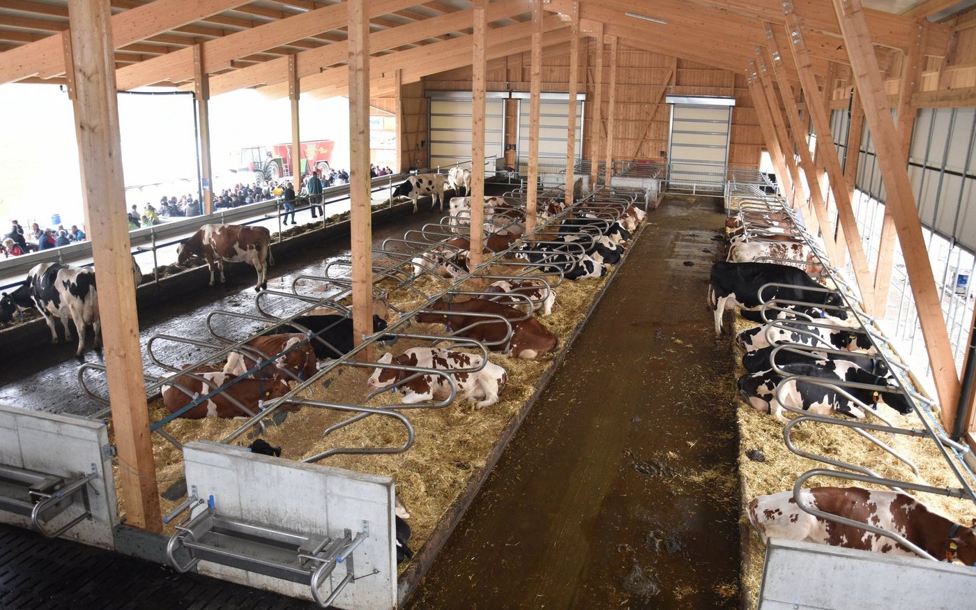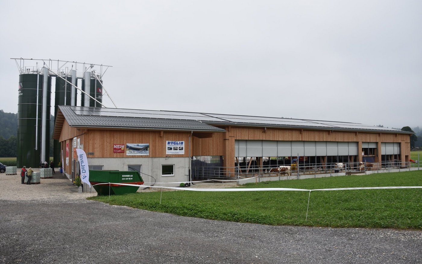 Obwohl der Stall mit 75 Liegboxen, noch nicht ganz ausgelastet ist, fühlen sich die 45 Kühe darin «sauwohl». Der Stall zeichnet sich aus durch viel Platz, viel Licht und viel frische Luft. Auch dem Tierwohl wurde grosse Beachtung geschenkt. Die Liegeboxen sind so ausgerüstet, dass die Kühe vorne am Kopf, viel mehr Bewegungsfreiheit haben. Auch die neuen Liegeboxenbügeln, sorgen für ein leichteres Aufstehen. Alle Kühe haben den Umzug vom Anbinde- in den Laufstall ohne Probleme überstanden. Keine einzige Kuh musste deswegen den Betrieb verlassen. Sogar die älteste, ein 14-jährige Kuh, fühlt sich im neuen Stall wie eine Zweijährige. Wer den neuen Stall bei Haslebachers noch sehen möchte, hat bis am Sonntagabend, denn 7. August, noch Zeit. Ein Besuch lohnt sich allemal.