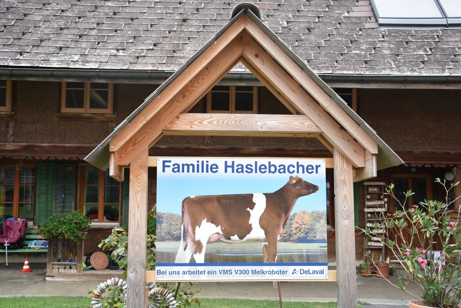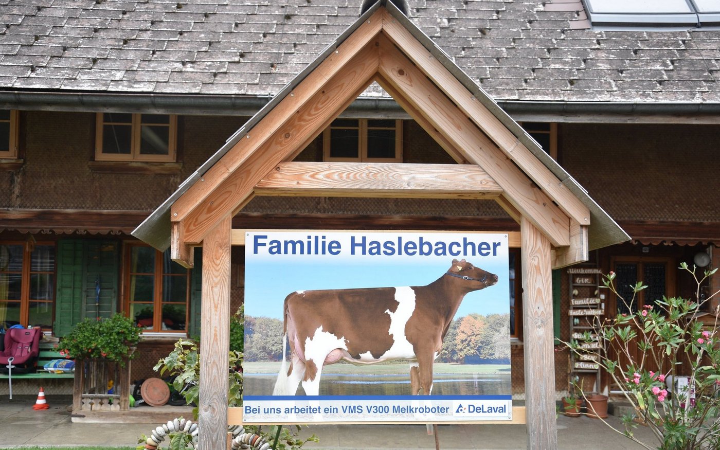 Schon von weit her, sieht man ihn, den neuen DeLaval-Normstall von der Familie Sandra und Samuel Haslebacher in Sumiswald BE. Der Milchviehstall, mit Melk- und Mistroboter, wurde nicht nur geplant von der Firma DeLaval, sondern er ist auch ausgerüstet mit einem DeLaval VMS V300 Melkroboter und mit einem DeLaval-Mistroboter.