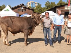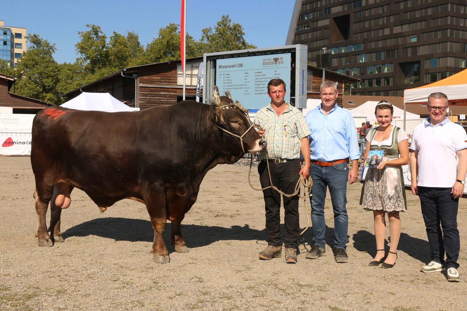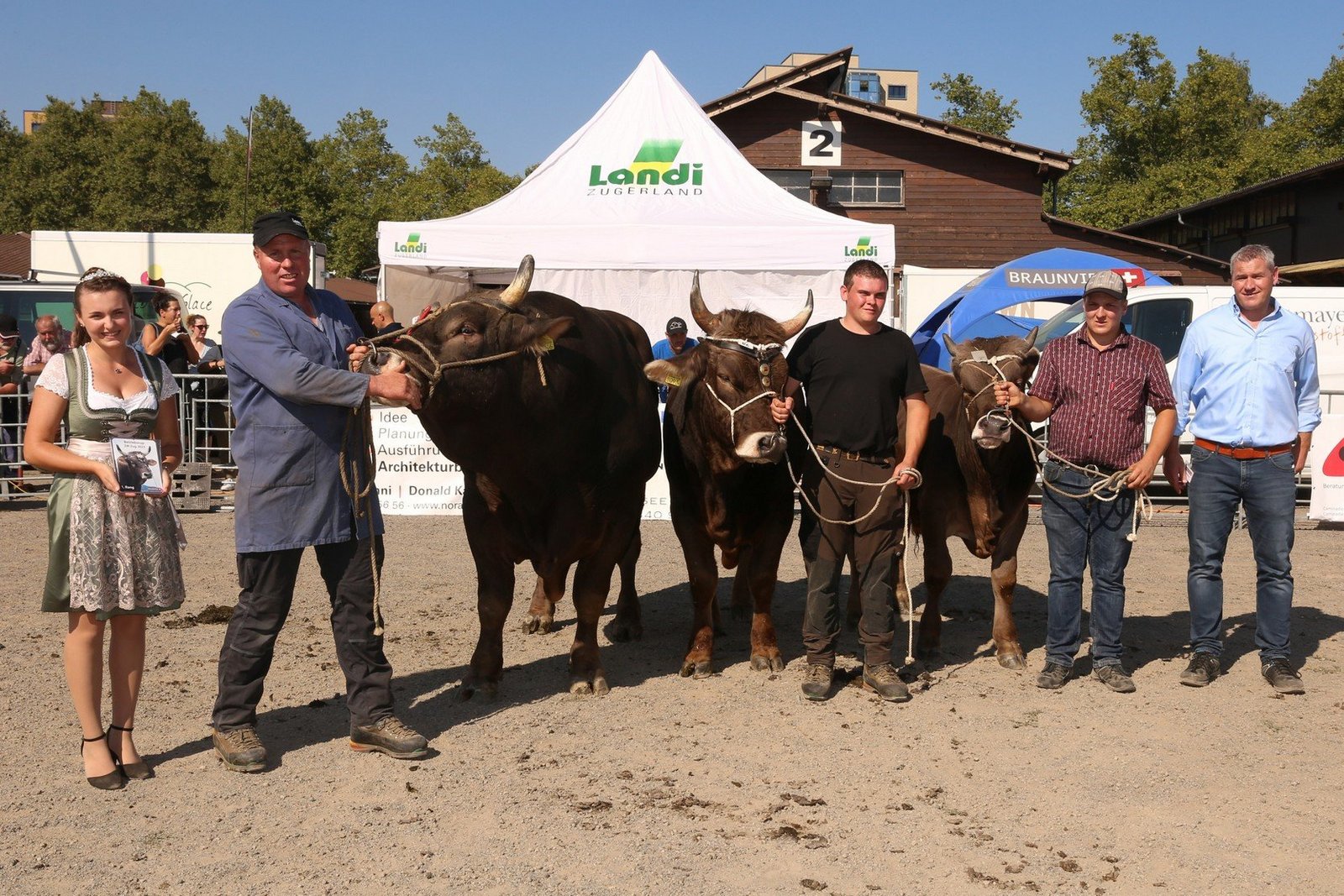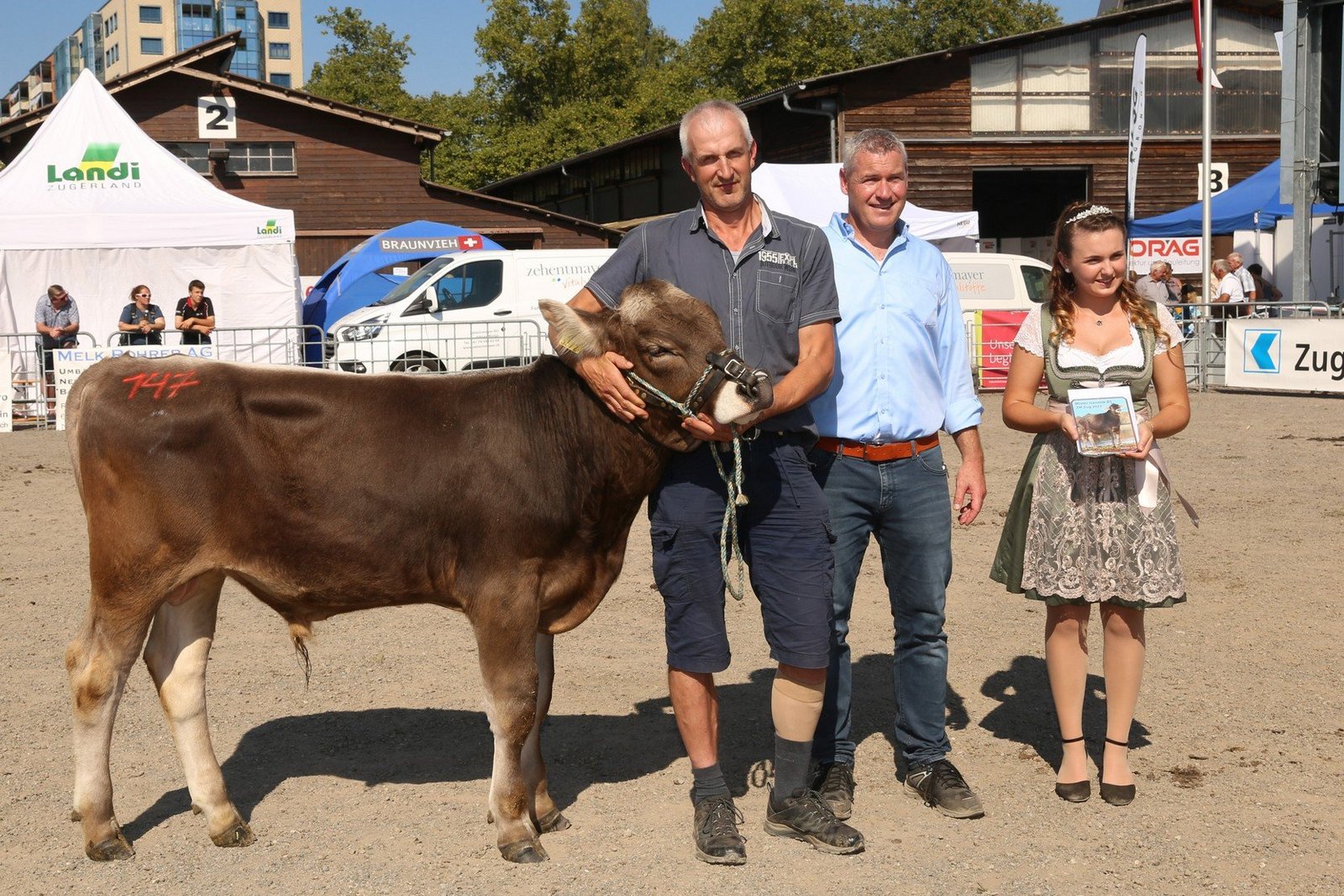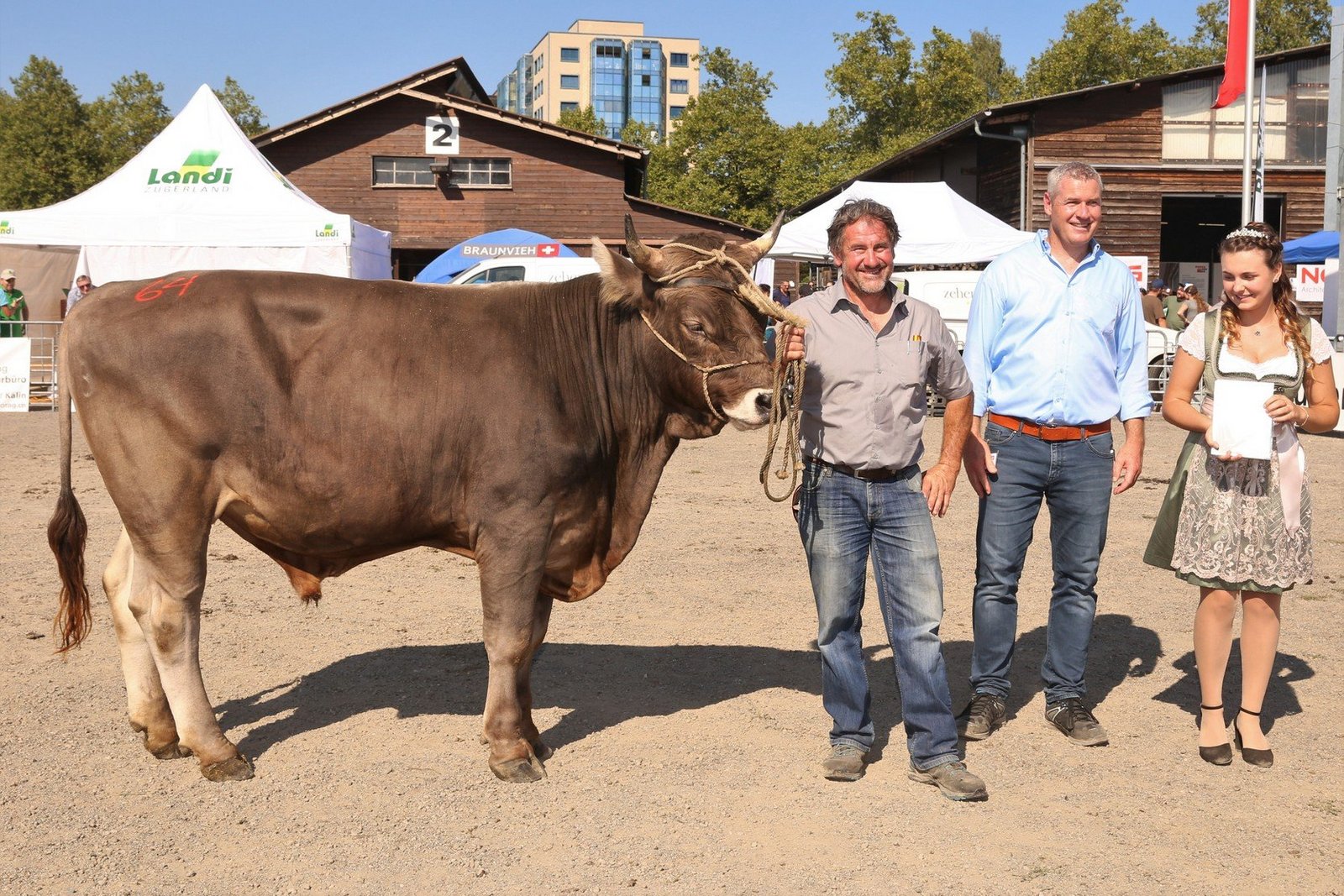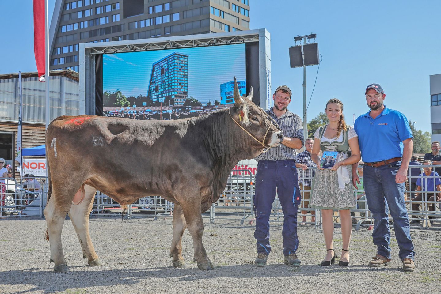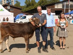 Der schönste Originalbraune-Jungstier heisst Ikarius und kommt aus dem Stall von Andrin Flükiger, Eptingen BL. Der Eros-Sohn stammt ursprünglich aus dem Zuchtbetrieb von Alfred und Judith Anderegg, Meiringen BE, wo Andrin Flükiger sein landwirtschaftliches Lehrjahr absolvierte. Alfred und Judith Anderegg hatten an diesem Tag noch einen Grund zur Freude: Mit drei ihrer Stiere gewannen sie den Betriebscup. Auf den Ehrenplatz kam mit den Gebrüdern Winterberger ebenfalls ein Zuchtbetrieb aus dem Berner Oberland.