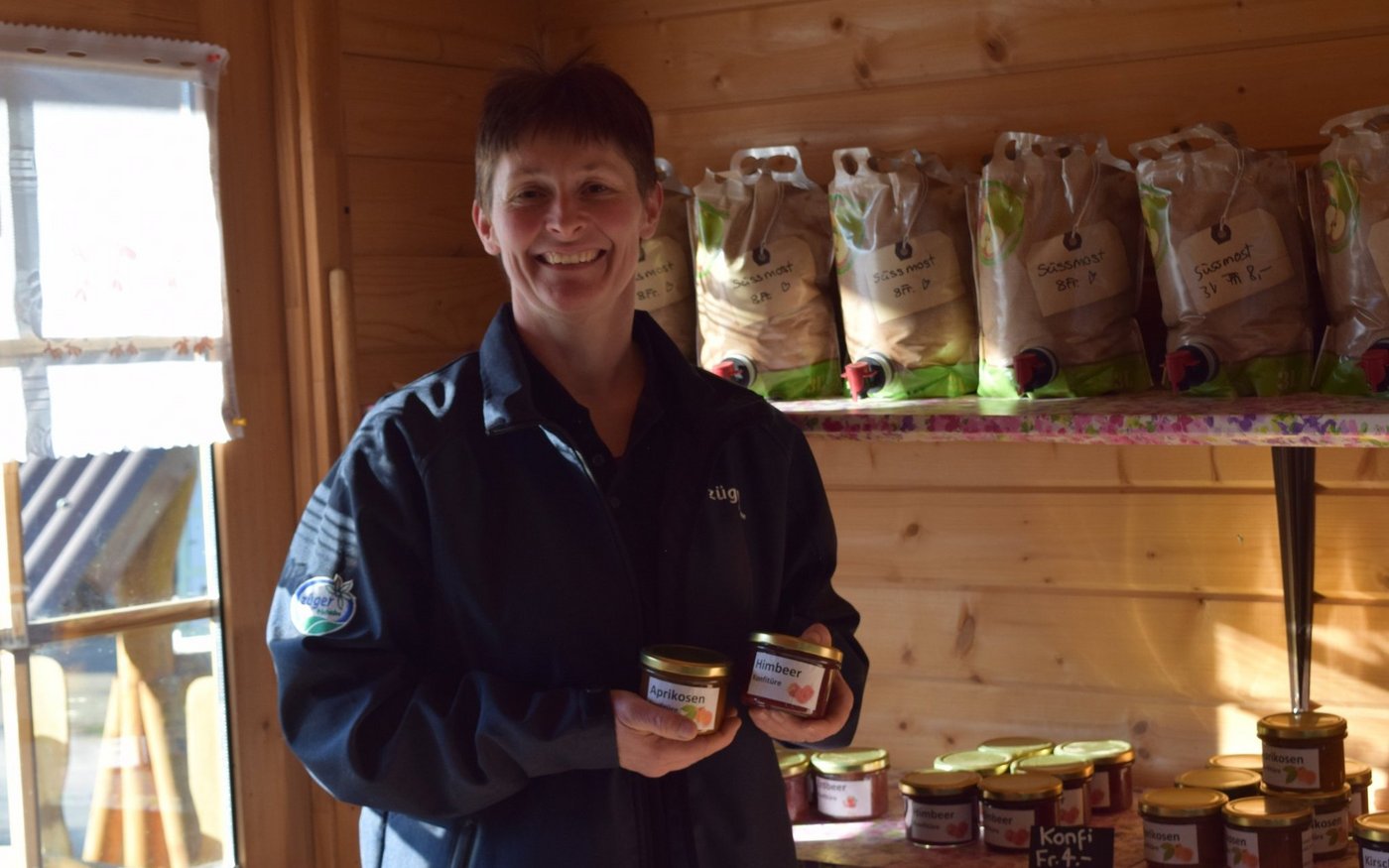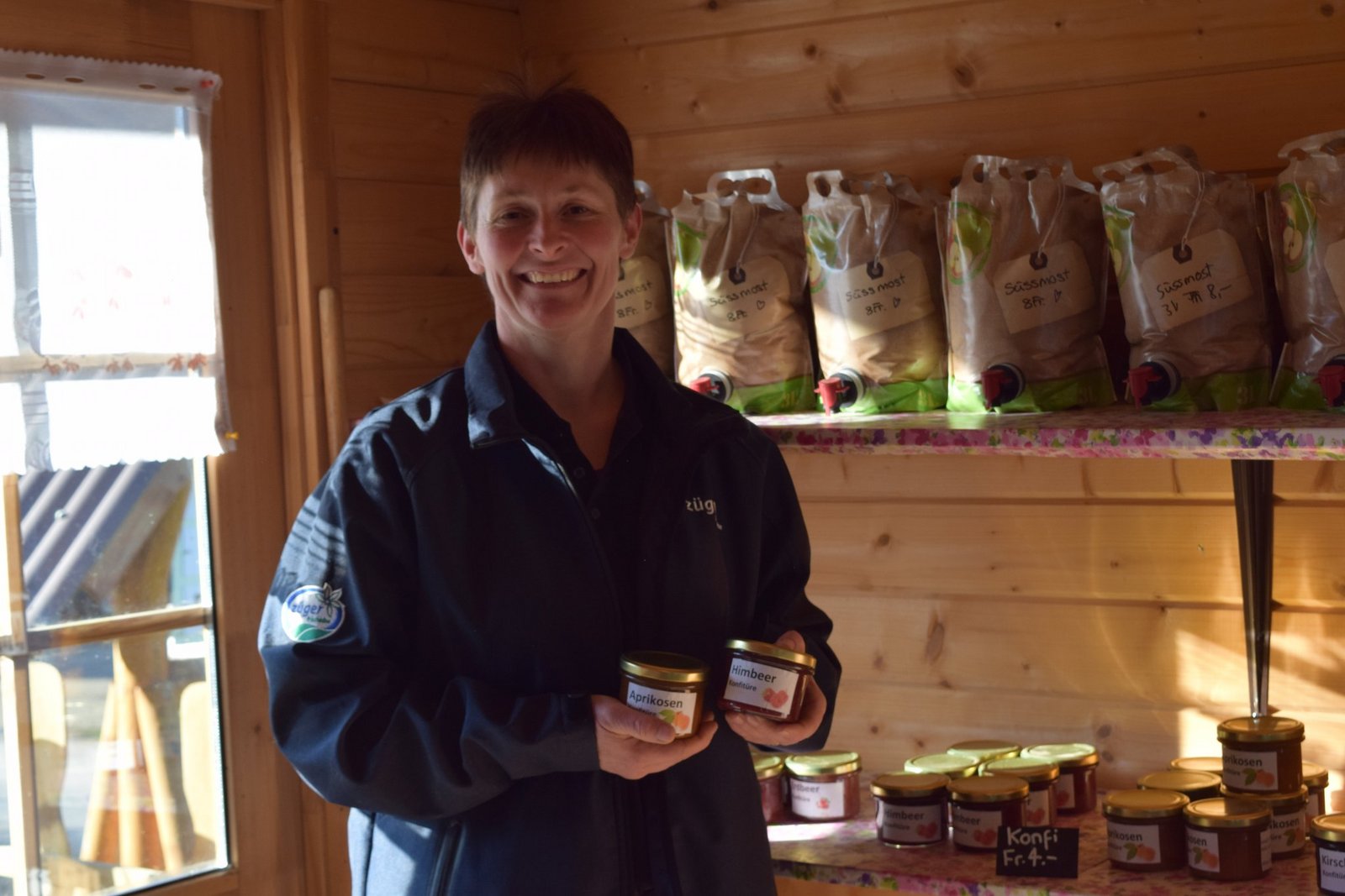 Einen kleinen Teil der Milch behält Andrea Scherrer zurück für den Verkauf im Hofladen. Dort finden die Kunden selbstgemachte Konfitüren, getrocknete Früchte, Alpkäse, Kartoffeln und Eier von Nachbarbetrieben und im Sommer die Früchte aus den eigenen Niederstamm-Obstanlagen.