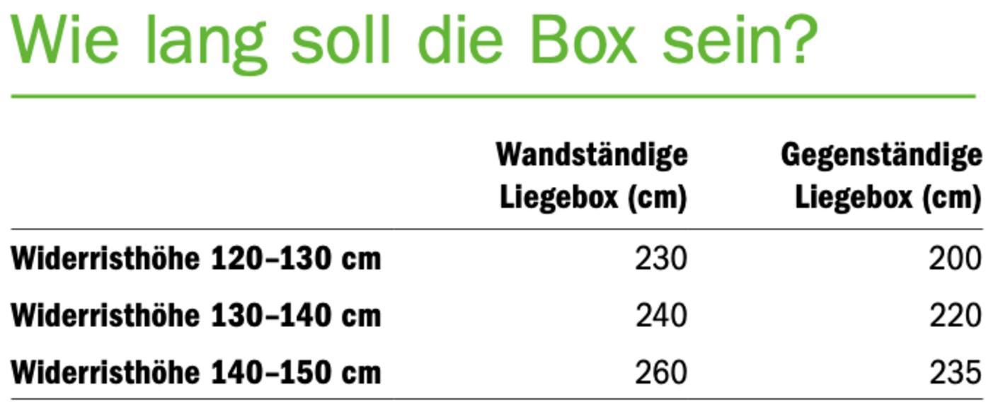 Einen weiteren wichtigen Bereich des Stalls bilde der Liegebereich. Hier sollte die Kuh zwölf bis vierzehn Stunden ihres Tages verbringen, denn beim Liegen wird am meisten Blut durch das Euter gepumpt, was dazu führt, dass während dieser Zeit ein bedeutender Anteil Milch produziert wird. Neben dem Untergrund des Liegebereichs sollten die Läger genügend lang sein, damit es der Kuh leichtfällt, aufzustehen, und sie sich entsprechend auch gerne hinlegt. Je nach Rasse sollte die Länge des Lägers auf die Grösse der Kuh abgestimmt werden (siehe Bild).