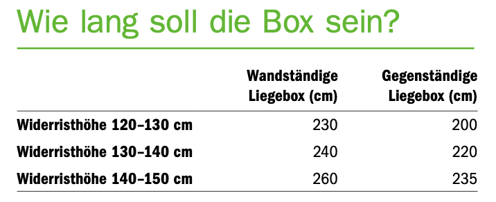 Nicht zu vergessen ist, der Kuh am Bugende genügend Schwungraum zu lassen, um ihr ein leichtes Aufstehen zu ermöglichen. Besonders ältere Tiere und Kühe, die mit der Milchproduktion eher am Limit laufen, benötigen diesen Schwungraum zum Aufstehen. Aus Sicht der Kuh empfiehlt es sich, den Liegeplatz länger zu Bauen als die Minimallängen vorgeben. Auch Nathalie Roth rechnete bei einer Holsteinkuh oder grossen Braunviehkuh (140-150 cm) mit einer Länge einer wandständigen Box von 3.2m (2m Läger, 1.2 m Schwungraum).