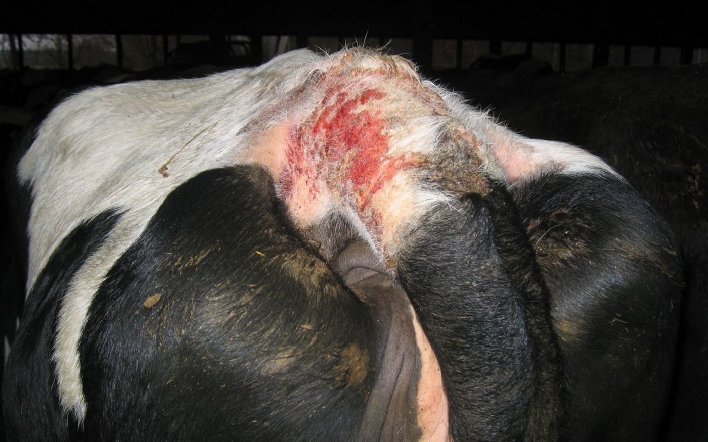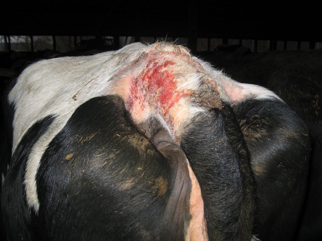 Die Räude können verschiedene Milbenarten verursachen, die auf oder in der Haut parasitieren. Eine Infektion führt bei den betroffenen Rindern zu Hautveränderungen wie starkem Juckreiz, Haarausfall und blutigem Wundscheuern. Wird der Befall nicht behandelt, kommt es zu starker Krustenbildung und Hautverdickung. Diese Veränderungen sind am Schwanzansatz, in Gelenkbeugen, an Milchspiegel und Schenkeln, am Hals und am Kopf zu finden. Durch das Scheuern und Kratzen können sich Wunden bilden, die wiederum ideale Infektionspforten für Pilzsporen (Flechten) und Bakterien darstellen.