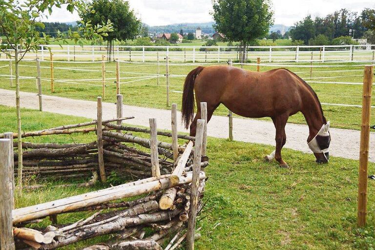 Die Verbindungswege, die Trails, sind in Heimenhausen 3,5 bis4 m breit. Wichtig ist, dass sie keine Sackgassen bilden. «Sie dürfen nicht matschig werden», betont der Eigentümer der Anlage. Dazu müssen sie durchlässig sein, aber an der Oberfläche dürfen sie ruhig hart sein. Zahnds haben Ecoraster direkt auf den Naturboden gelegt und darüber groben Rundkies gestreut. InZukunft möchten sie Erbsen-kies verwenden. «Ein Aktivstall bietet viele ungenutzte Nischen, um etwas für die Natur und andere Tierarten zu schaffen», macht Fabienne Meier von der Beratungsfirma Faunadea aufmerksam.