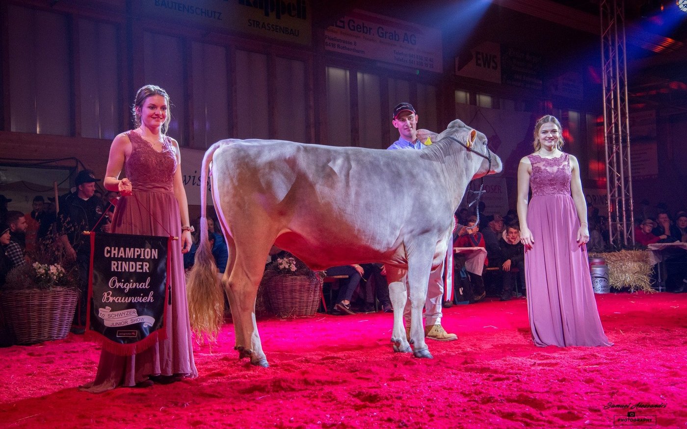 Der Schwyzer Viehzuchtverband durfte an der Junior Show 28 Brown Swiss- und 14 Original Braunvieh Erstmelkkühe ausstellen. Bei der Zuchtrichtung Brown Swiss dominierte die Phil Tochter Paris von Markus Kennel, Steinerberg. Sie wurde vom Urner Experten Daniel Gisler sowohl in der Championwahl wie auch im Schöneuterwettbewerb zur Siegerin gekürt. Im Euterwettbewerb standen mit Eichholz Gen Rocky Kelly von Fredi Diethelm, Tuggen und Schatt's Haegar Zilona von Anna-Louise Strodthoff und Armin Schatt, Feusisberg zwei Tiere aus dem äusseren Kantonsteil auf dem Podest. In der Championwahl komplettierten Büeler's BS Phil Chiquita von Roman Büeler aus Seewen und Höfli's Capucino Calanda von Roland Gwerder, Muotathal das Podest.