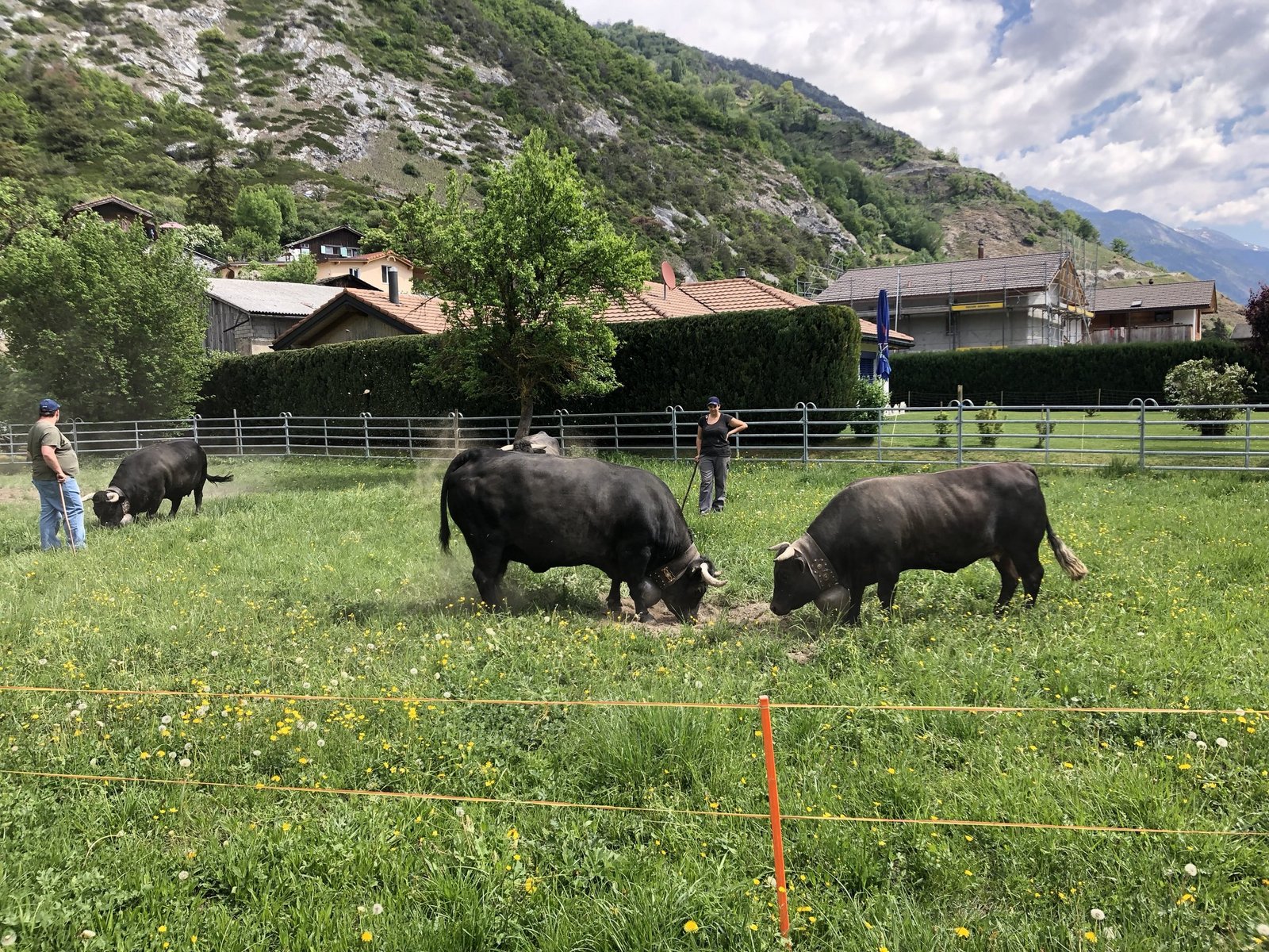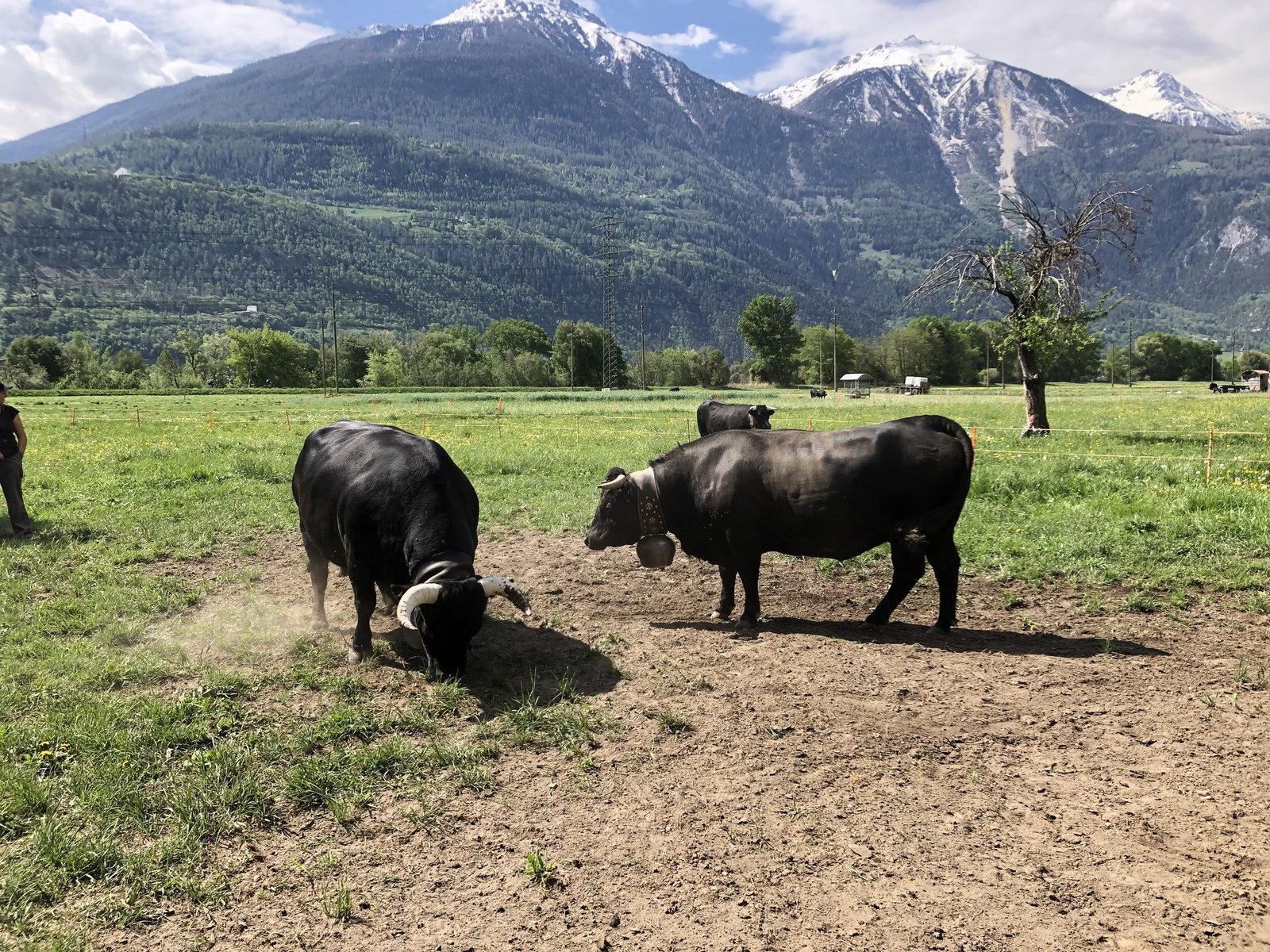 Da sich die Situation mit den drei Kühen auf der Wiese bislang nicht verändert hat, wird eine vierte dazu gebracht. Myrtille, Jahrgang 2012, ist keine reinrassige Eringerkuh, sondern zur Hälfte Evolèner, eine alte Walliser Kuhrasse. Sie hat mehrere weisse Zeichnungen, unter anderem einen grossen, hellen Fleck auf ihrer Flanke, der wie eine Null geformt ist. Scherzhaft nennen Passeraubs die Kuh deshalb «das Nulli». Myrtylle ist aber keineswegs eine Null: Sie hat an einem Qualifikationskampf schon eine Glocke gewonnen und ist eine erfahrene Kämpferin. Nach wenigen Augenblicken lässt sie sich schon auf ein erstes Kämpflein mit einer ihrer Stallgenossinnen ein, die prompt vor dem ambitionierten Neuankömmling zurückweicht. «Jetzt geht es also los», denke ich mir und bin gespannt, was nun passiert.