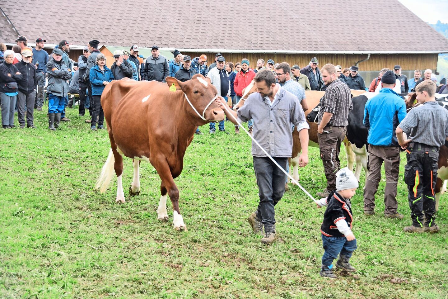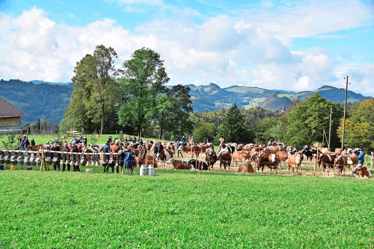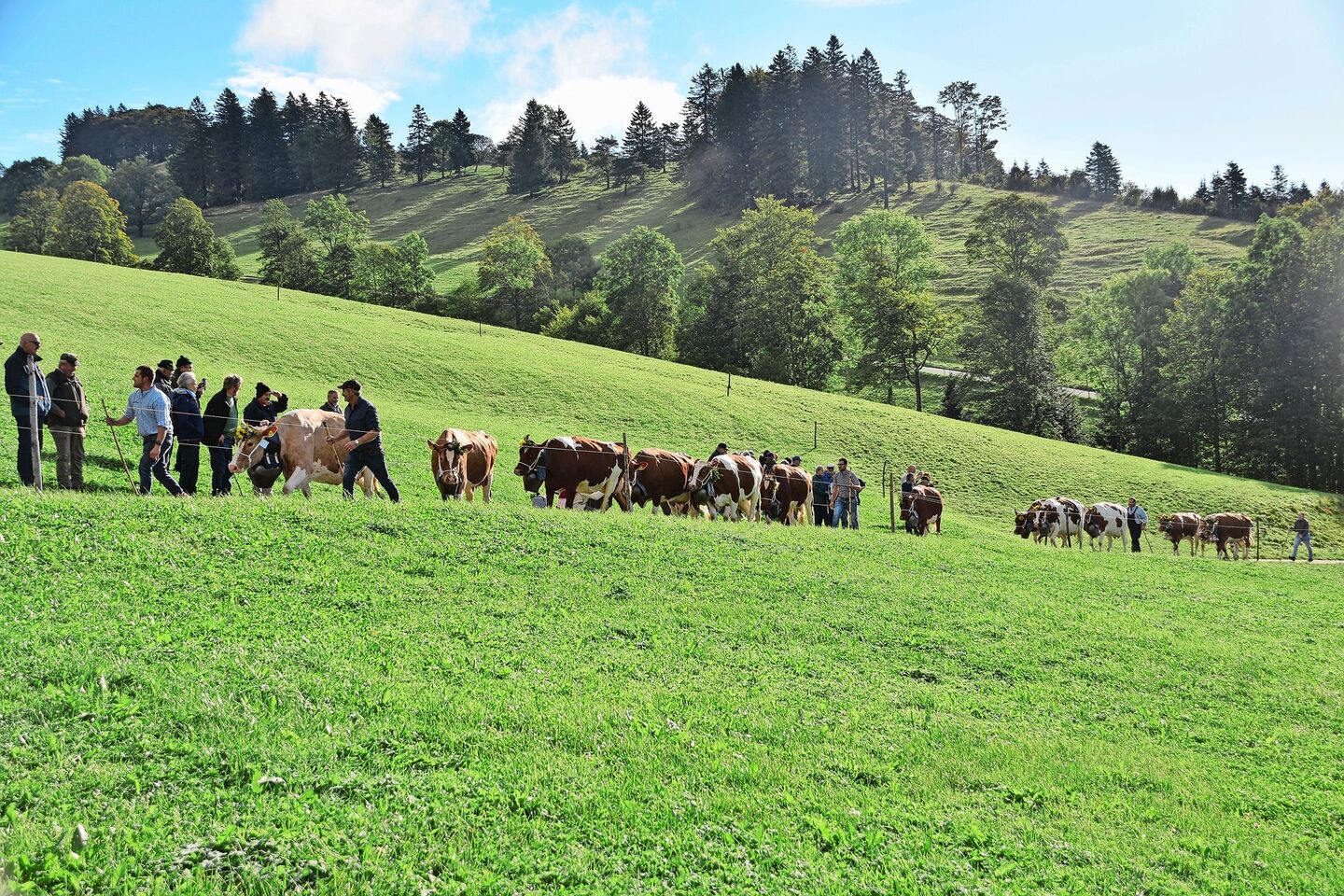 Auch am Mittwoch, 2. Oktober, liessen es sich die Züchterinnen und Züchter vom VZV-Passwang nicht nehmen, den vielen Zuschauerinnen und Zuschauern einen unvergesslichen Tag zu bieten. Dieser fing schon an, als die fünf Betriebe ihre Kühe mit einer «Zügleten» auf den Schauplatz, auf den mittleren Passwang, zum Betrieb der Familie Paul Lisser trieben. Obwohl die Familie Lisser ihre Tiere nur aus dem Stall an die Latten hätte binden können, machte auch sie am Morgen einen Umweg, um mit ihren Kühen einen eindrücklichen Alpaufzug zu zelebrieren.